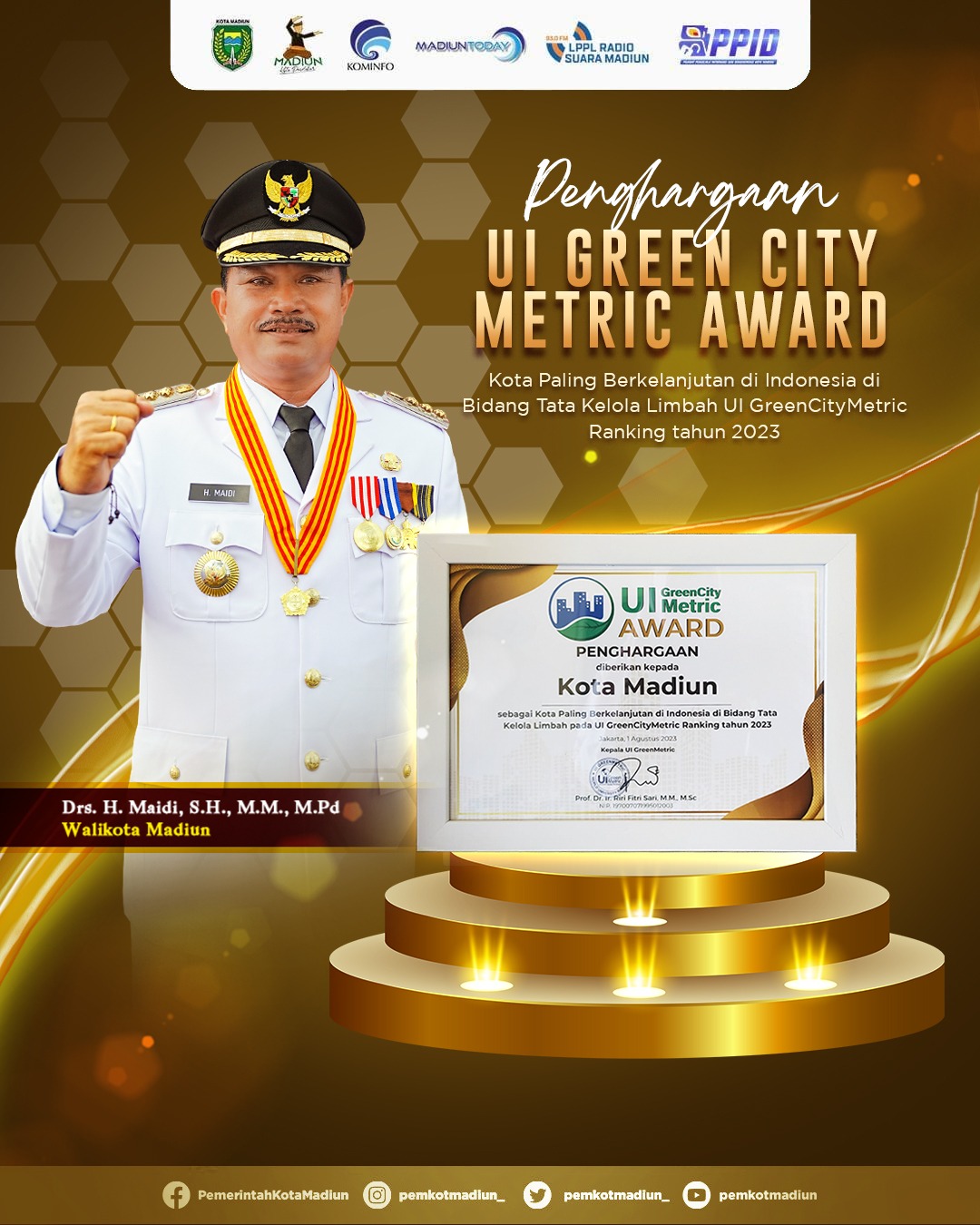 Penghargaan itu memang diterima Sekda Soeko mewakili Wali Kota Madiun. Penghargaan diterima pada saat acara Pengumuman dan Pemberian Anugerah UI Green City Metric 2023 di Balai Sidang UI Kampus Depok, Selasa (1/8/) kemarin. Setidaknya, ada lima bidang penghargaan. Selain bidang Tata Kelola Limbah, ada juga bidang Penataan Ruang dan Infrastruktur, Energi dan Perubahan Iklim, Tata Kelola Air, Akses dan Mobilitas, serta bidang Tata Pamong. Selain itu, kota dan kabupaten peserta penilaian juga dilakukan perankingan. Kota Madiun menempati peringkat ketiga Kota Paling Berkelanjutan tahun ini.