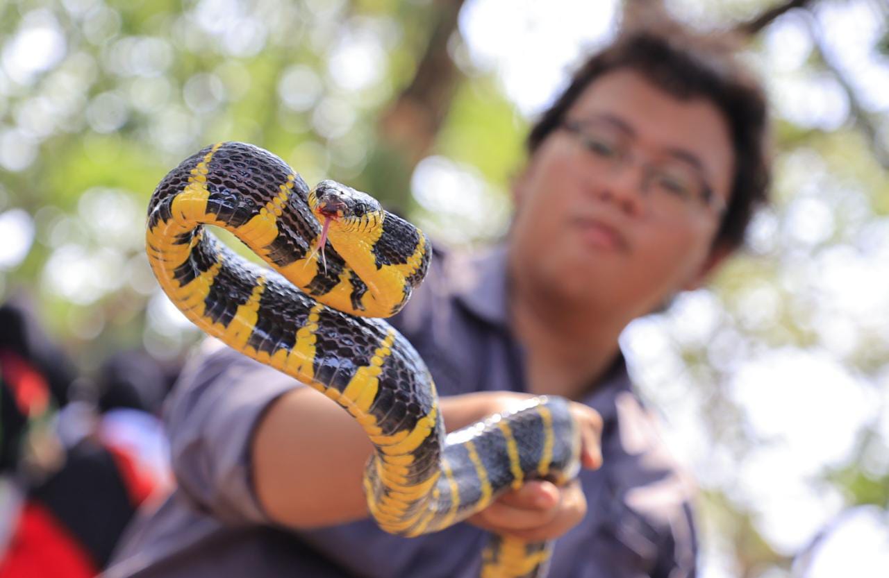Peserta Kemah Besar SMP Negeri 9 mengikuti edukasi tentang ular di Bumi Perkemahan Rowo Bening Kota Madiun, Kamis (03/08/2023). Edukasi tentang ular ini diampu oleh Komunitas Exalos (Exotic Animal Lover) Madiun. Tujuan edukasi ini agar para siswa mengenal tentang ular dan paham tentang peran penting ular dalam rantai makanan yang berdampak langsung dengan ekosistem. (WS Hendro/madiuntoday.id)