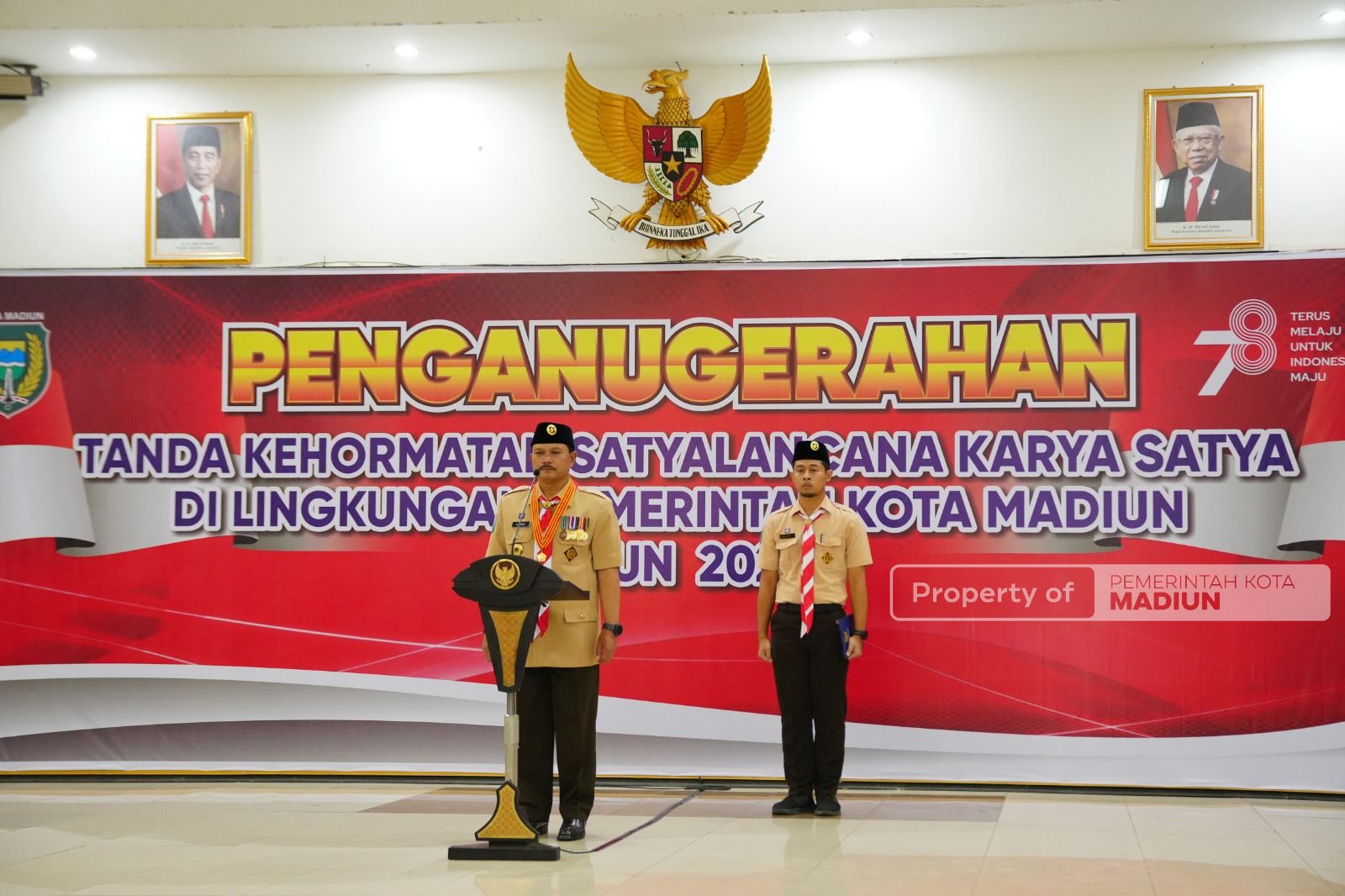 MADIUN – Aparatur Sipil Negara (ASN) Pemerintah Kota Madiun terbukti memiliki dedikasi tinggi. Buktinya, sebanyak 326 ASN Pemkot Madiun berhasil mendapatkan Tanda Kehormatan Aatyalancana Karya Satya dari Presiden Republik Indonesia. Selain dedikasi, ratusan ASN tersebut layak diberikan tanda kehormatan karena loyalitas hingga kedisiplinan. Prosesi penyematan lencana dilakukan Wali Kota Madiun, Maidi di Asrama Haji Kota Madiun, Senin (14/8).