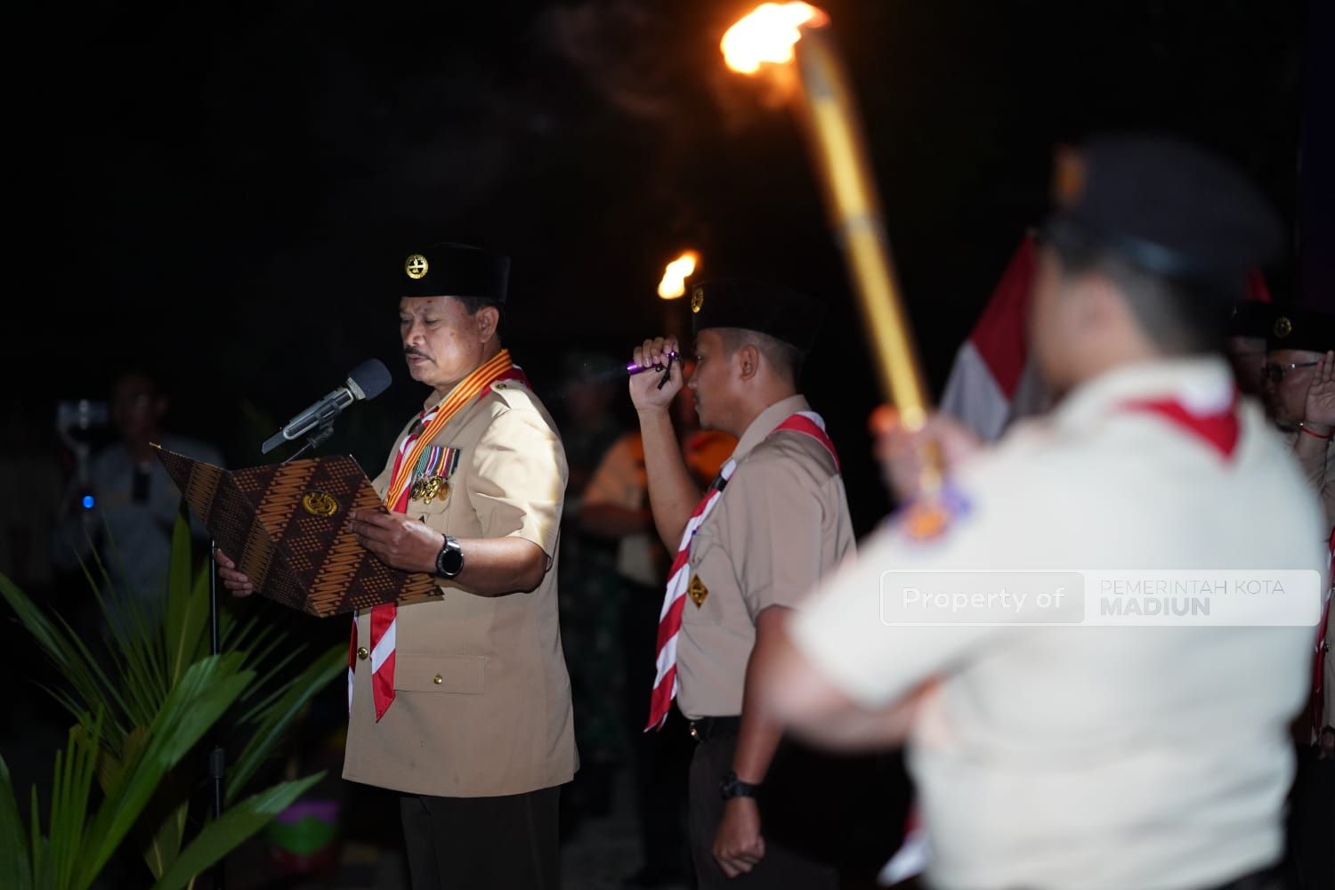 MADIUN – Rangkaian peringatan Hari Ulang Tahun (HUT) ke-62 Praja Muda Karana (Pramuka) Kwarcab Kota Madiun dimulai. Upacara Renungan Ulang Janji pun digelar, Minggu (13/8) malam. Upacara yang bertempat di Ngrowo Bening Edupark itu pun berlangsung khidmat. Wali Kota Madiun, Maidi selaku Kamabicab memimpin jalannya upacara renungan tersebut.