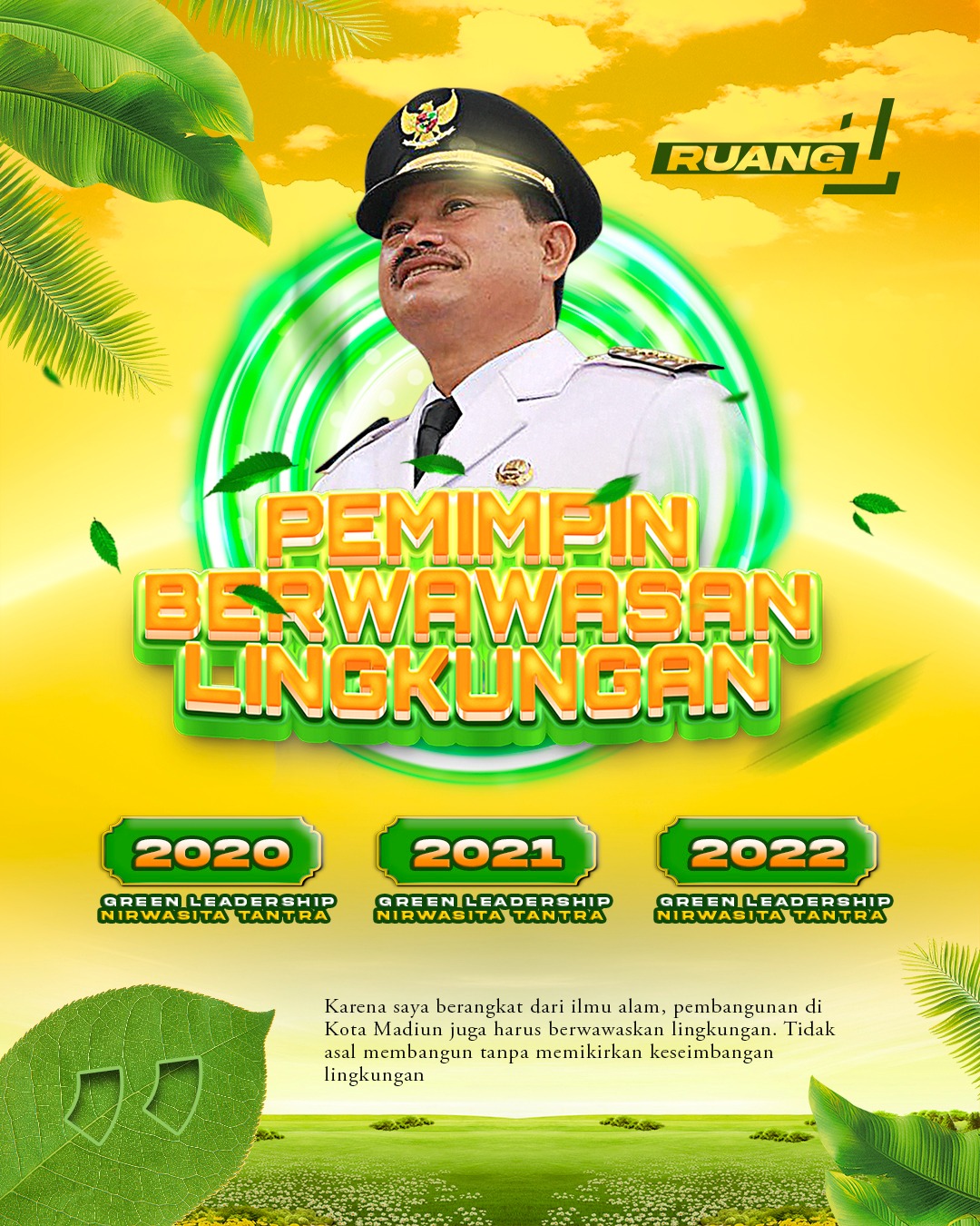 Pemimpin di Kota Madiun sejatinya sudah menerapkan itu. Hal itu dibuktikan dari diraihnya penghargaan Green Leadership Nirwasita Tantra dari Kementerian Lingkungan Hidup dan Kehutanan. Bukan hanya sekali, tetapi kota kita sudah mendapatkan penghargaan itu untuk 2020. Penghargaan diberikan pada 2021. Kota kita kembali berhasil mendapatkan itu di tahun berikutnya. Bukan hanya saya, tetapi juga ketua DPRD kita. Saya mendapatkan penghargaan sebagai Kepala Daerah Kategori Kota Sedang Terbaik II dalam Pengelolaan Lingkungan Hidup dan Kehutanan Daerah Tahun 2021. Sementara Ketua DPRD Kota Madiun Andi Raya Bagus Miko Saputra mendapatkan penghargaan sebagai Terbaik II Kategori Kota Sedang dalam Pengelolaan Lingkungan Hidup dan Kehutanan Daerah Tahun 2021. Pengharagaan diberikan pada 2022 lalu.
