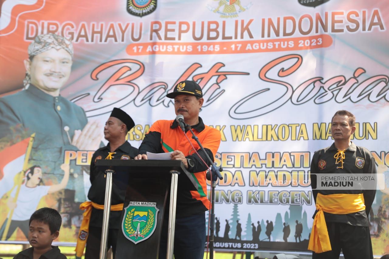 MADIUN – Peringatan HUT Kemerdekaan RI bisa dengan cara apa saja. Tidak melulu melalui lomba-lomba, momentum HUT ke-78 Kemerdekaan RI ini bisa diperingati dengan berbagi. Seperti yang dilakukan Persaudaraan Setia Hati Winongo Tunas Muda (PSHWTM) ranting Klegen ini. Para anggota organisasi pencak silat tersebut melaksanakan bakti sosial, Minggu (27/8). Kegiatan tersebut juga dihadiri Wali Kota Madiun, Maidi yang datang memenuhi undangan.