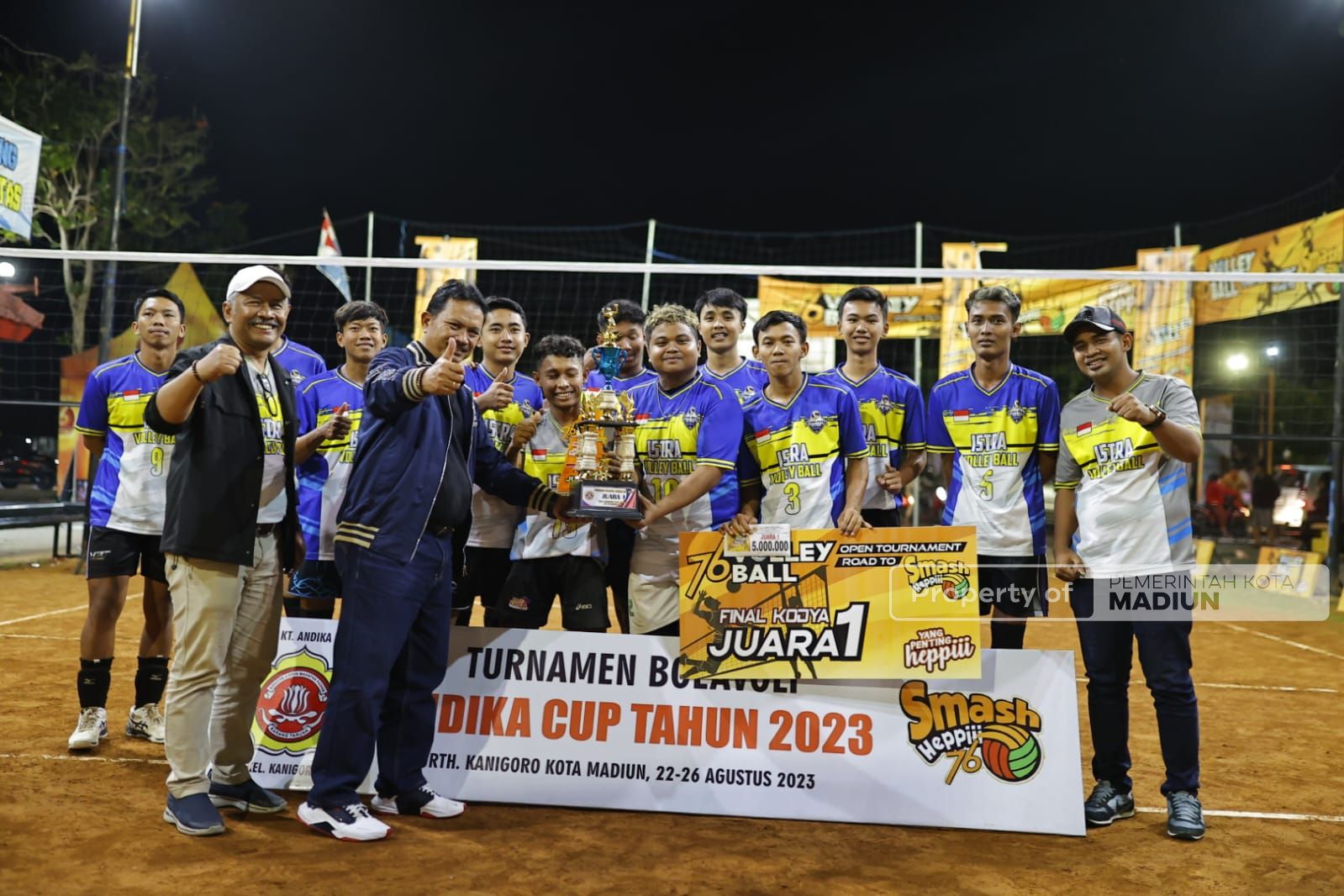 MADIUN – Turnamen Bola Voli Andika Cup Kelurahan Kanigoro resmi berakhir, Sabtu (26/8) malam. Turnamen bola voli tingkat Kota Madiun dan sekitar bertajuk Smash Hepii 76 tersebut menyajikan pertandingan seru lagi menarik. Tak hanya itu, kegiatan juga memberikan banyak manfaat. Tak heran, Wali Kota Madiun, Maidi yang hadir dalam penutupan turnamen tersebut memberikan apresiasinya.
