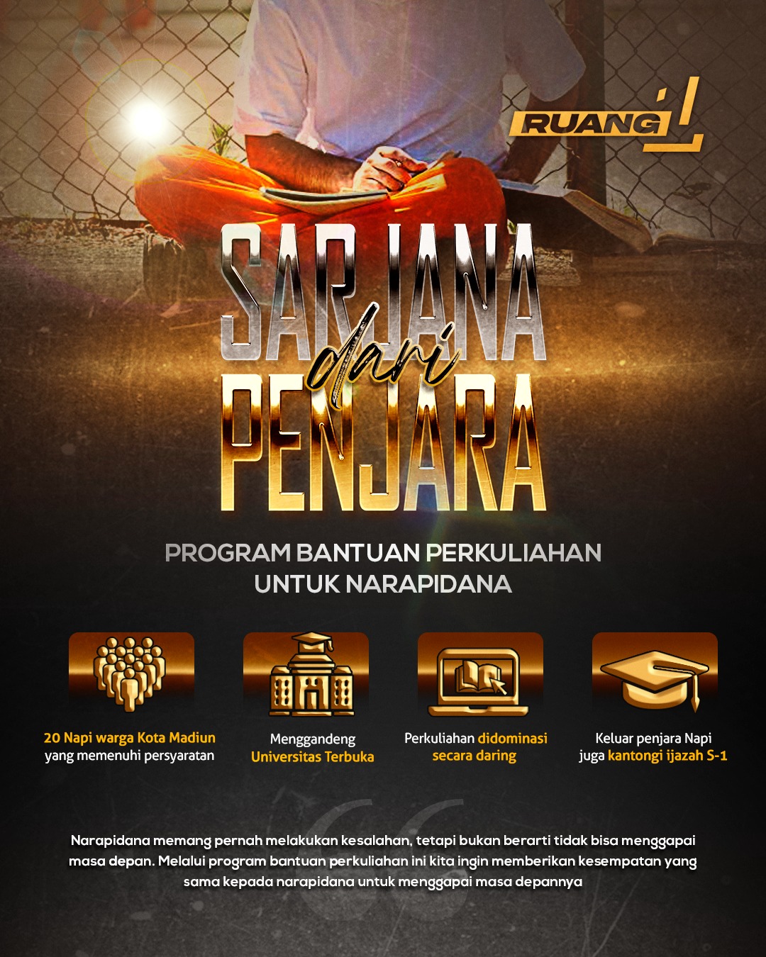 Narapidana memang pernah melakukan kesalahan, tetapi bukan berarti tidak bisa menggapai masa depan. Melalui program bantuan perkuliahan ini kita ingin memberikan kesempatan yang sama kepada mereka untuk menggapai masa depannya. Hukuman tetap dijalani sebagai konsekuensi atas kesalahan yang dilakukan. Disamping itu, masa depan terus dipersiapkan. Jangan sampai keluar dari penjara hanya menjadi korban perubahan. Apalagi, kemudian malah dikucilkan dari masyarakat karena status mantan napi tersebut. Salah-salah, mereka bisa kembali membuat kesalahan. Kembali masuk ke rumah pesakitan. Tentu itu tidak kita inginkan.
