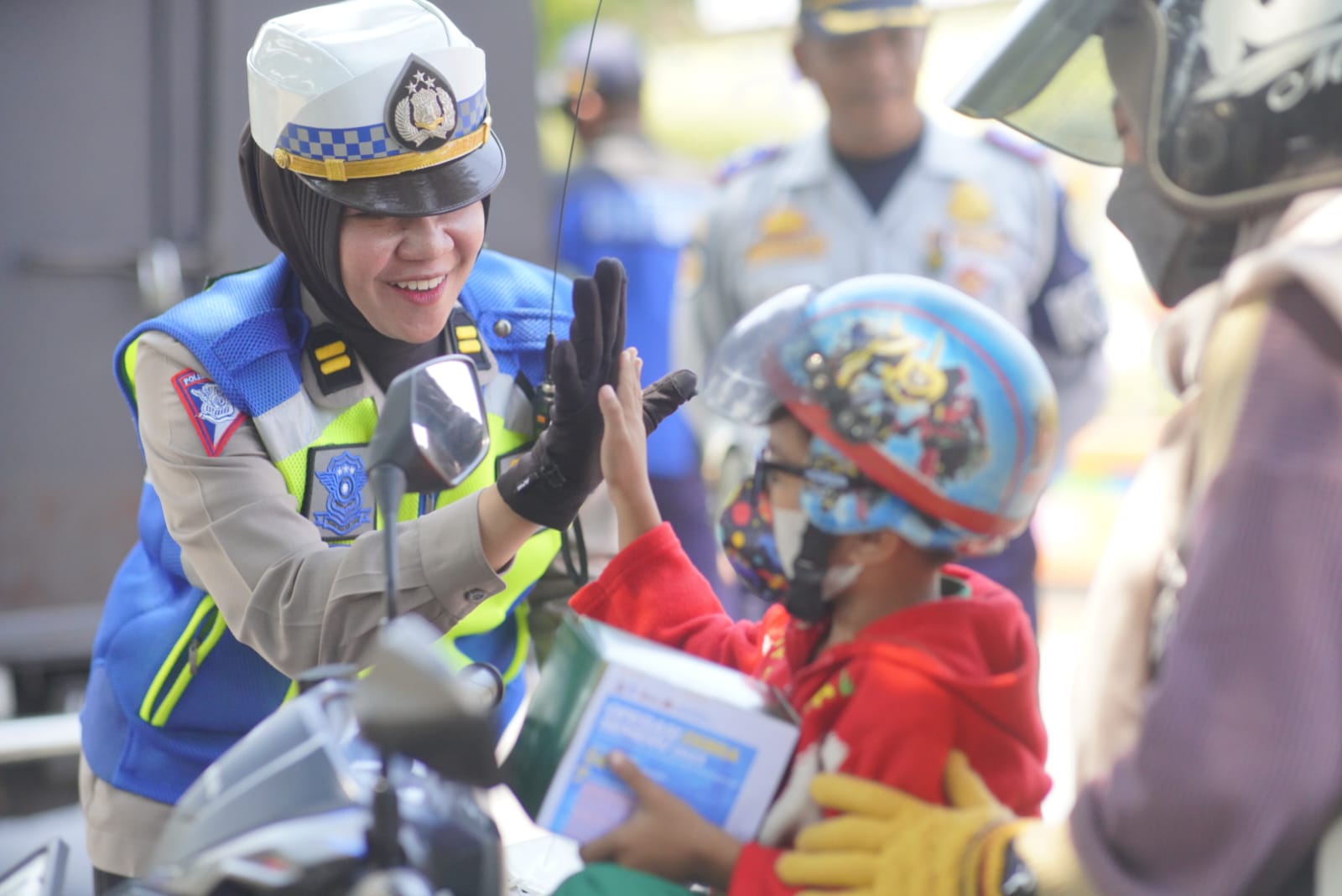 Pengendara yang melanggar aturan otomatis langsung dikenakan sanksi tilang. Namun, bukan itu saja. Petugas juga memberikan apresiasi bagi pengendara yang taat aturan. Yakni, dengan membagikan bingkisan sebagai hadiah karena telah mematuhi aturan lalu lintas dan menjadi pengendara yang bijak.
