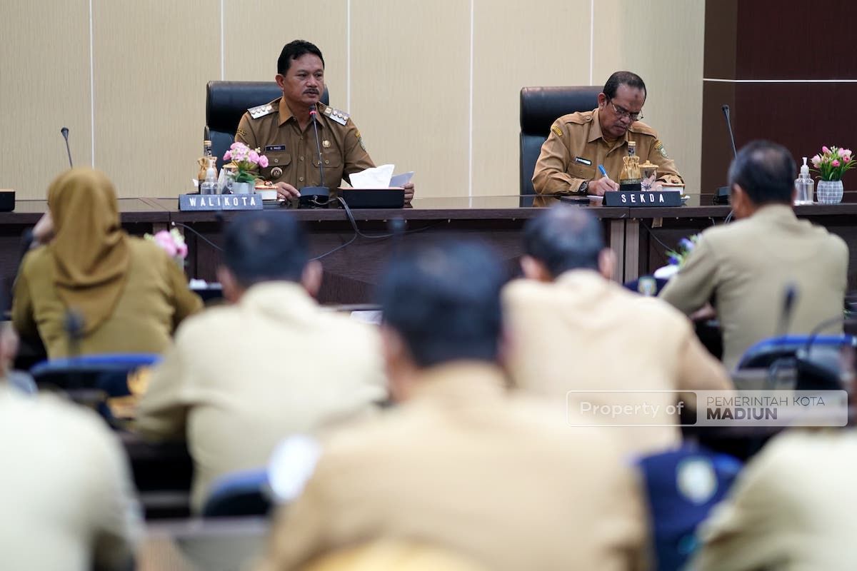 MADIUN - Wali Kota Madiun Maidi menggelar rapat dinas dan pembinaan pejabat di lingkungan Pemkot Madiun. Kegiatan tersebut berlangsung di Ruang 13 Balai Kota Madiun, Senin (11/9).