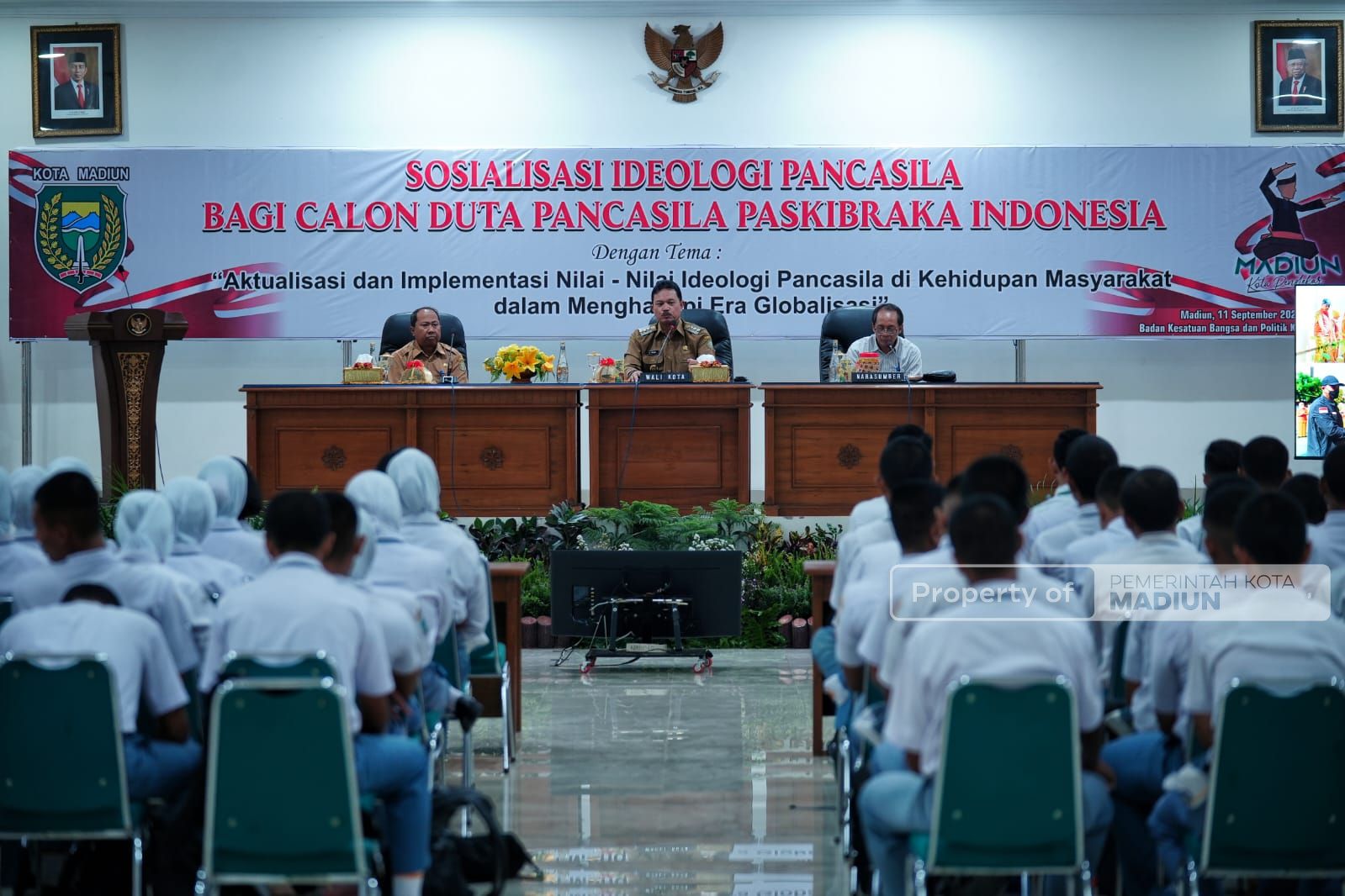 MADIUN – Penanaman ideologi Pancasila penting untuk selalu dilakukan. Sosialisasi kembali dilakukan Pemerintah Kota Madiun melalui Badan Kesatuan Bangsa dan Politik (Bakesbangpol) setempat. Sasarannya juga beragam. Sosialisasi kali ini menyasar purna Paskibra 2023 Kota Madiun. Harapannya, ideologi Pancasila tersebut semakin tertanam di benak pelajar yang telah menjalankan tugas besar Agustus lalu. Sosialisasi semakin menarik lantaran langsung diberikan Wali Kota Madiun, Maidi.