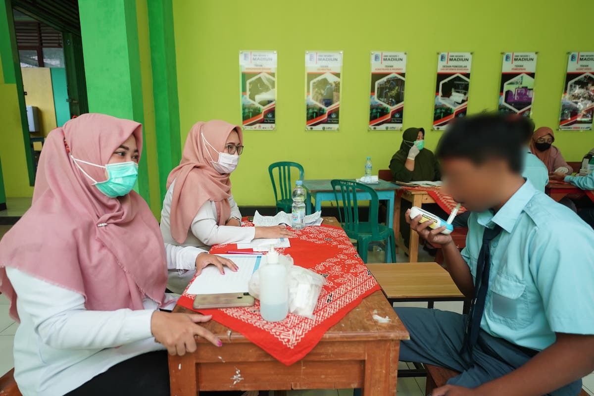 Dalam kegiatan tersebut, tim kesehatan puskesmas mengunjungi sekolah-sekolah yang ada di wilayah puskesmas setempat untuk melakukan pengecekan terhadap siswa usia 10-18 tahun. Salah satunya seperti yang terlihat di SMKN 1 Madiun, Rabu (13/9).