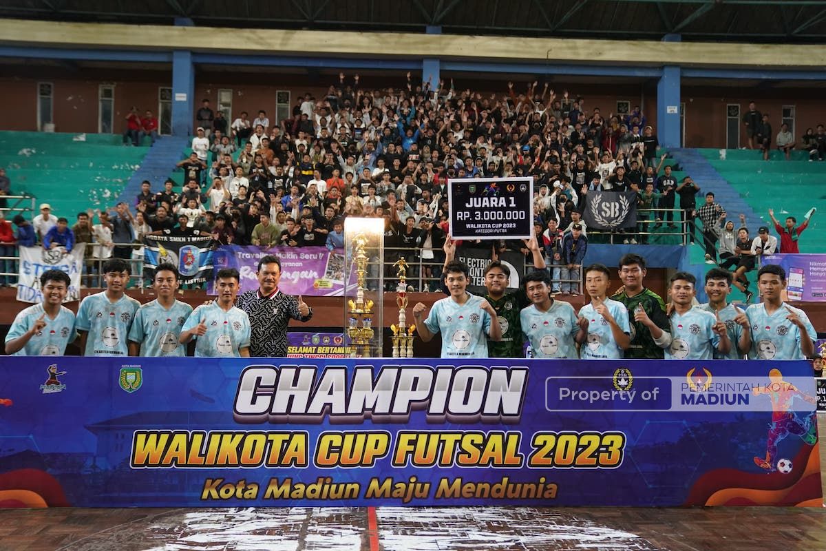 MADIUN – Futsal Wali Kota Cup 2023 resmi berakhir, Minggu (17/9) malam. Seluruh pertandingan menarik tersaji sejak awal kompetisi yang berlangsung di GOR Stadion Wilis Kota Madiun tersebut. Wali Kota Madiun, Maidi kembali hadir di partai pamungkas tersebut untuk menyerahkan piala sekaligus menutup gelaran kompetisi. Orang nomor satu di Kota Pendekar tersebut berharap hadirnya kompetisi bisa menjadi ajang peningkatan kualitas atlet futsal Kota Madiun dan sekitar.
