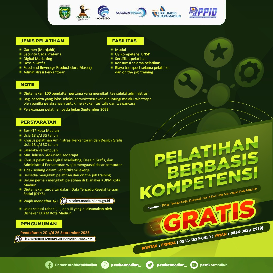 MADIUN – Dinas Tenaga Kerja, Koperasi, Usaha Kecil, dan Menengah Kota Madiun kembali membuka pelatihan berbasis kompetensi. Setidaknya, ada enam jenis pelatihan yang dibuka kali ini. Yakni, pelatihan Garmen (menjahit), Security Gada Pratama, Digital Marketing, Design Grafis, Food and Beverage Product (juru masak), dan Administrasi Perkantoran. Pendaftaran peserta sudah dibuka sejak 20 September kemarin dan akan ditutup 26 September mendatang.