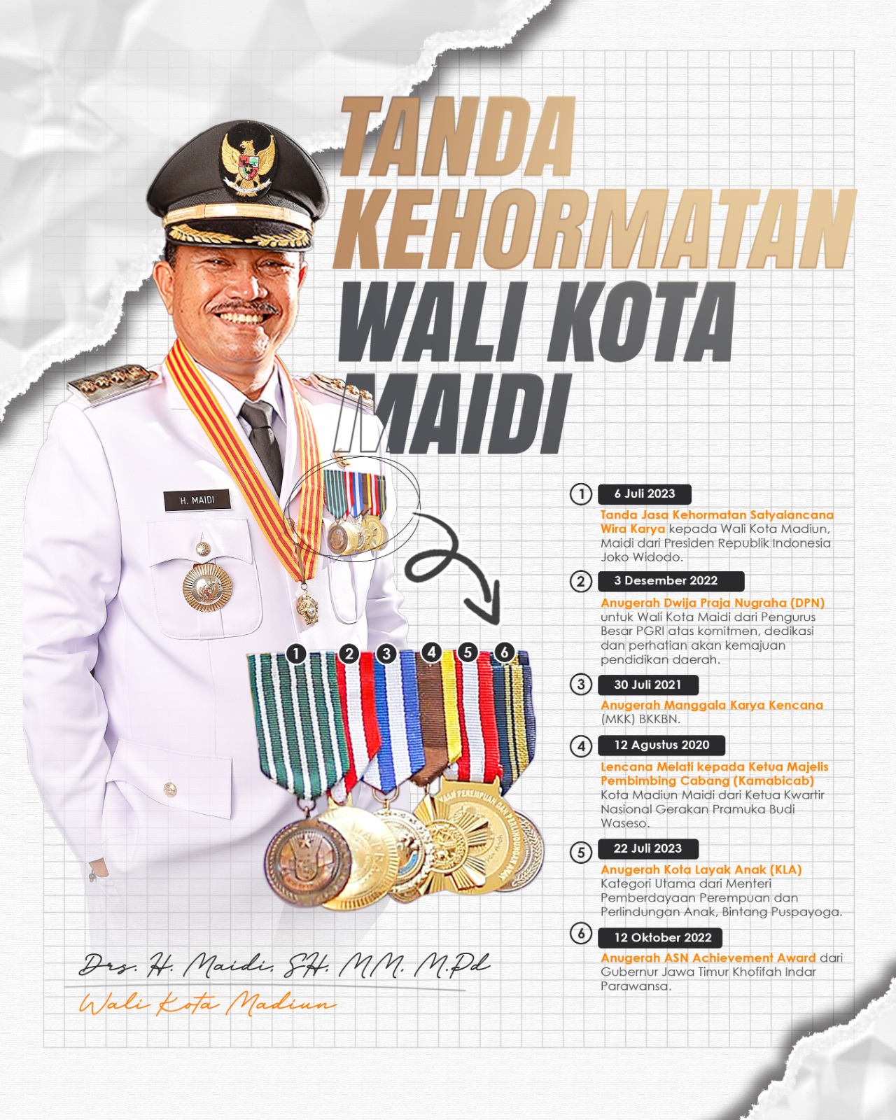Di antara ratusan penghargaan dan prestasi tersebut, Wali Kota Maidi juga mengukir sejumlah tanda kehormatan. Setidaknya, sudah ada enam tanda penghargaan yang berhasil diraih. Nah, berikut enam tanda penghargaan yang pernah didapat mantan Sekda Kota Madiun tersebut.