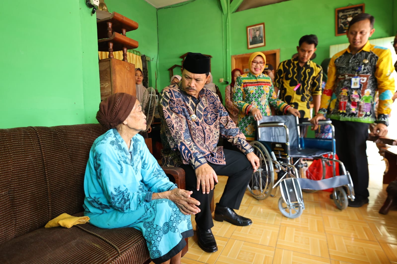 MADIUN - Wali Kota Maidi didampingi Ketua TP PKK Yuni Setyawati Maidi kembali berkeliling menyalurkan bantuan kursi roda kepada para lansia yang membutuhkan.