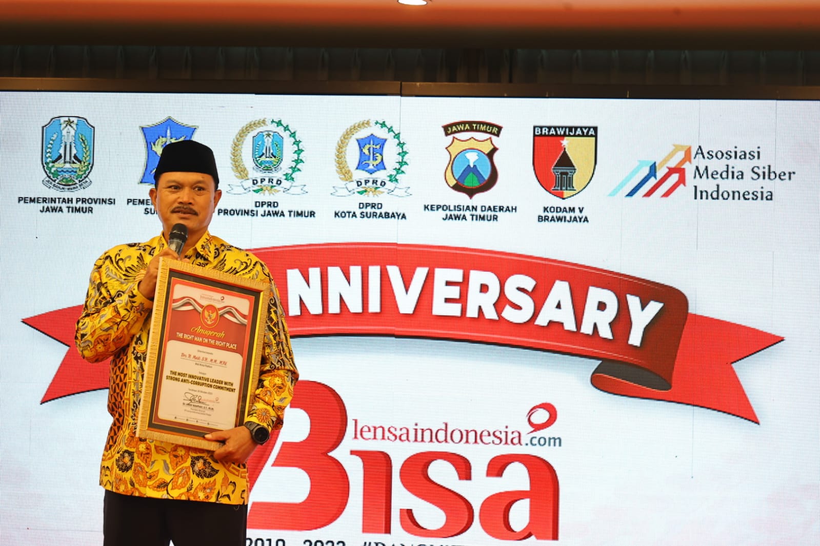 SURABAYA – Keberhasilan Wali Kota Madiun kembali mendapat perhatian dari media massa. Kali ini datang dari Media lensaindonesia.com yang menggelar awarding untuk kepala daerah. Wali Kota Maidi pun mendapatkan penghargaan bertajuk The Right Man On The Right Place tersebut, Senin (30/10). Wali Kota Maidi mendapatkan penghargaan kategori The Most Innovative Leader With Strong Anti-Corruption Commitment. Penghargaan itu diberikan bersamaan kegiatan puncak peringatan HUT ke-13 lensaindonesia.com di Novotel Samator Surabaya, Senin (30/10).
