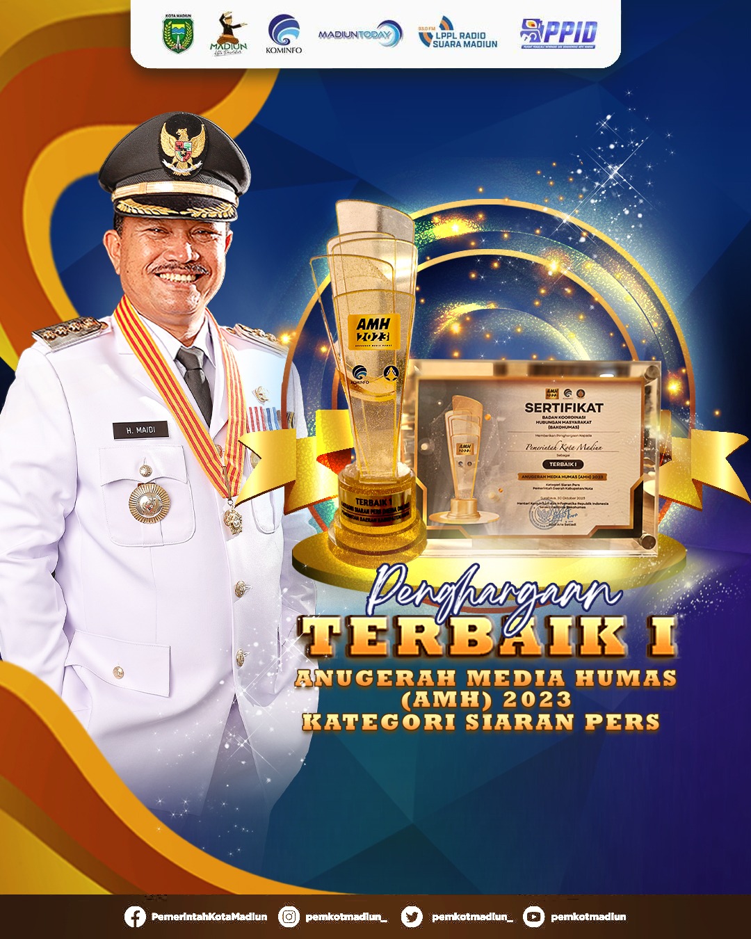 Tak tanggung-tanggung, Dinas Kominfo Kota Madiun berhasil menjadi terbaik pertama kategori siaran pers dalam AMH yang digelar Badan Koordinasi Hubungan Masyarakat (Bakohumas) Kementerian Kominfo tersebut. Sertifikan dan piala penghargaan diterima Kepala Dinas Kominfo Kota Madiun, Noor Aflah bersamaan malam Anugerah Media Humas 2023 di The Westin Surabaya, Pakuwon Mall, Senin (30/10) malam.
