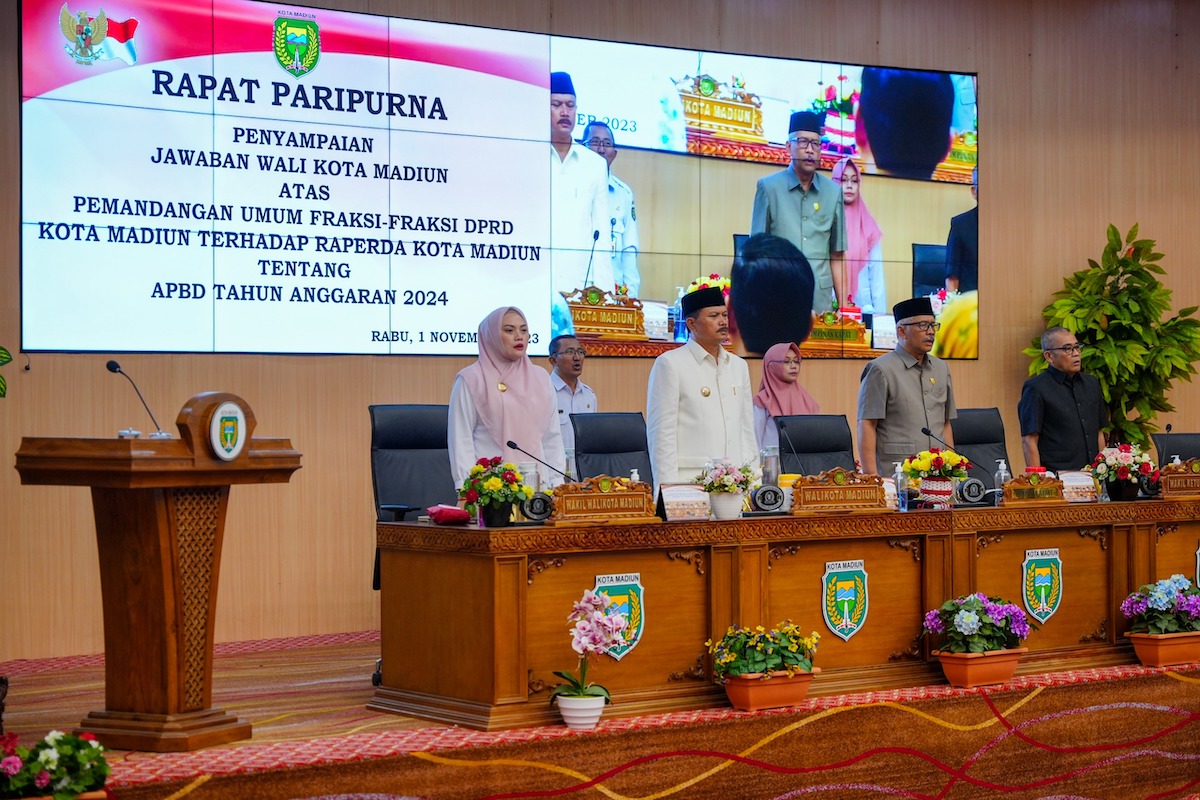 MADIUN - Wali Kota Maidi bersama dengan Dewan Perwakilan Rakyat Daerah (DPRD) Kota Madiun menggelar rapat paripurna dengan agenda penyampaian jawaban wali kota Madiun atas pemandangan umum fraksi-fraksi DPRD Kota Madiun terhadap raperda kota tentang APBD tahun anggaran 2024.