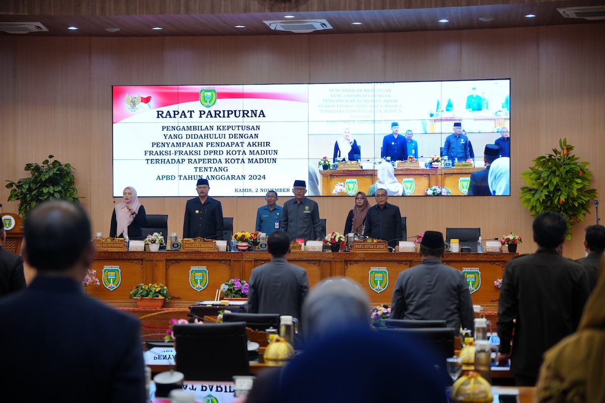 MADIUN - Pemerintah Kota Madiun bersama DPRD setempat menggelar rapat paripurna, Kamis (2/11) . Yakni, dengan agenda pengambilan keputusan yang didahului dengan penyampaian pendapat akhir fraksi-fraksi DPRD Kota Madiun atas Raperda tentang APBD Tahun Anggaran 2024.