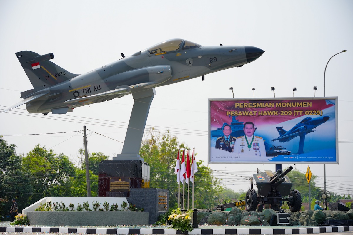 Pesawat HAWK 200 TT-0229 resmi menghiasi exit TOL Dumpil Madiun. Monumen Elang besi tersebut diresmikan Panglima TNI Laksamana Yudo Margono, Sabtu (11/11). Pesawat Hawk 200 dengan tail number TT-0229 ini sebelumnya pernah dioperasikan oleh Skadron Udara 1 Lanud Supadio Pontianak. Pemasangan monumen ini merupakan hasil kerja keras Skadron Teknik 042 Lanud Iswahjudi Madiun pada September lalu. Pesawat Hawk 200 yang telah berjasa dalam menjaga keamanan dan kedaulatan negara tersebut kini telah menjadi bagian dari pemandangan ikonik di exit TOL Dumpil Madiun. (rams/agi/madiuntoday)