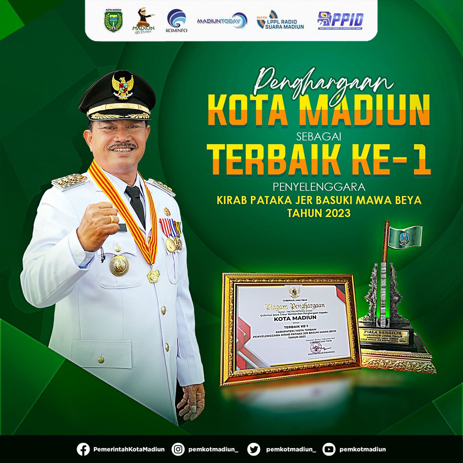 MADIUN - Kota Pendekar tak pernah sepi prestasi. Terbaru, penghargaan diberikan untuk Kota Madiun atas prestasinya sebagai penyelenggara terbaik pertama Kirab Pataka Jer Basuki Mawa Beya Tahun 2023 Provinsi Jawa Timur.