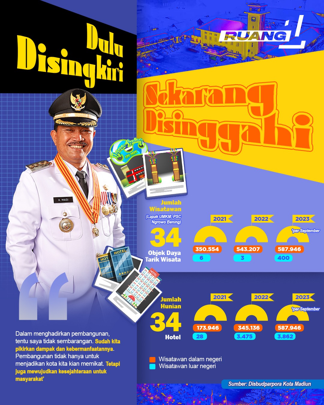 Alhamdulillah, perlahan permasalahan-permasalahan itu mulai terurai kini. Jalan Pahlawan sudah tidak ada lagi genangan. Sungai yang kotor sudah jadi tempat wisata enam negara. Tanpa paspor tanpa visa. Kota kita yang dulu disingkiri, kini disinggahi. Wisatawan datang silih berganti. Data yang dihimpun OPD terkait, jumlah wisatawan tercatat mengalami peningkatan setiap tahun. Setidaknya, ada 350.554 wisatawan di 2021. Jumlah tersebut meningkat menjadi 543.207 di tahun berikutnya. Sementara di 2023 ini tercatat sebanyak 587.946 wisatawan hingga September lalu. Itu pun hanya wisatawan domestik. Kota kita juga didatangi wisatawan manca negara. Tercatat ada 400 wisatawan luar negeri di 2023 ini.