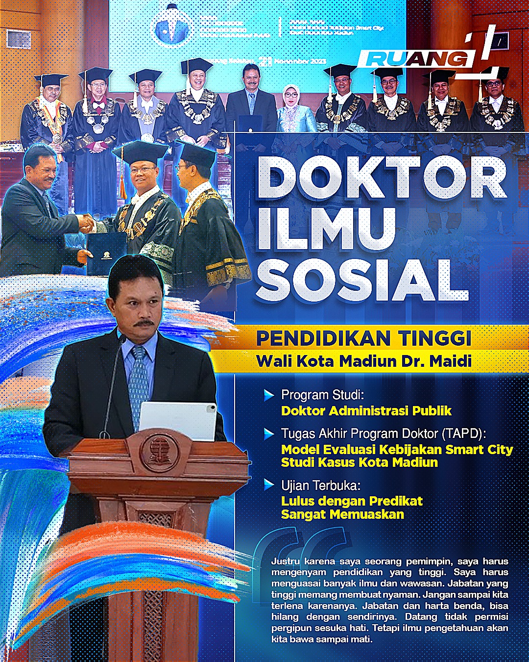 Namun, bagi saya ilmu sosial ini sangatlah penting. Sebagai wali kota, saya adalah pelayanan masyarakat, pelayan publik. Saya harus mempelajari ilmu tentang publik agar pelayanan yang saya berikan bisa optimal. Selain itu, saya ingin menilai kebijakan yang sudah berjalan di kota kita. Apa yang menjadi disertasi saya adalah kebijakan-kebijakan yang sudah berjalan di Kota Madiun. Khususnya kebijakan terkait program smart city. Secara mudahnya, saya praktik dulu, baru kemudian teorinya saya tuangkan dalam disertasi. Ternyata hasilnya sangat memuaskan penguji. Secara tidak langsung, kebijakan yang saya ambil untuk kota kita sudah tepat.