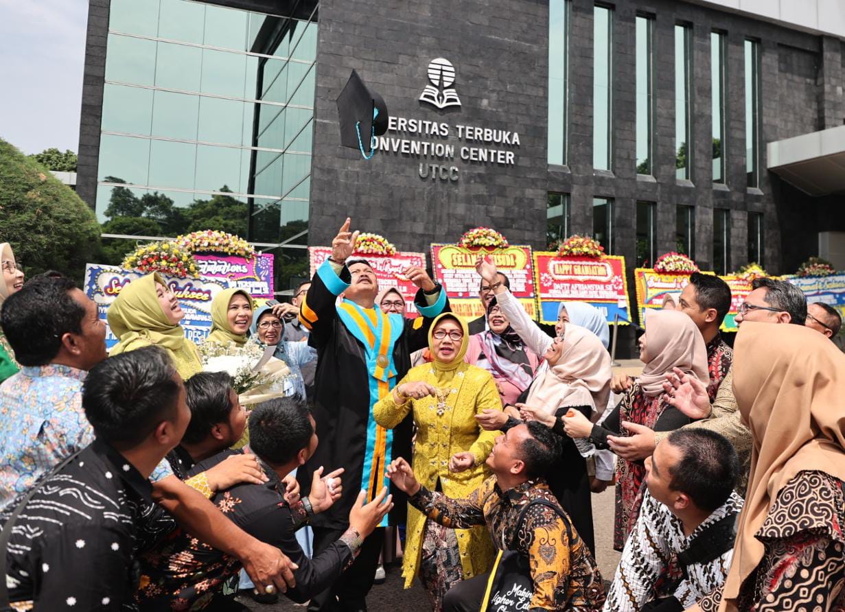 TANGERANG – Wali Kota Madiun, Maidi resmi menyandang status doktor. Upacara wisuda digelar di Gedung Universitas Terbuka Convention Center (UTCC), Tangerang Selatan, Selasa (28/11). Orang nomor satu di Kota Pendekar itu ditetapkan sebagai wisudawan kehormatan. Wali Kota Dr. Maidi tak sendiri. Ada ribuan wisudawan lain dari berbagai jenjang dan program studi yang diwisuda.