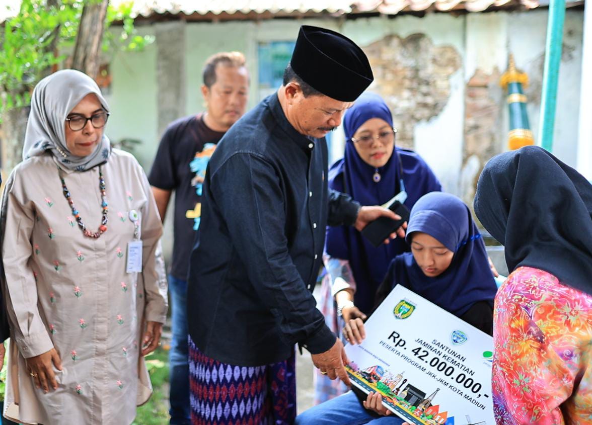 MADIUN - Wali Kota Madiun, Dr.Maidi menyalurkan santunan program jaminan kecelakaan dan jaminan kematian (Pro JKK-JKM) kepada ahli waris peserta Pro JKK-JKM yang meninggal dunia.