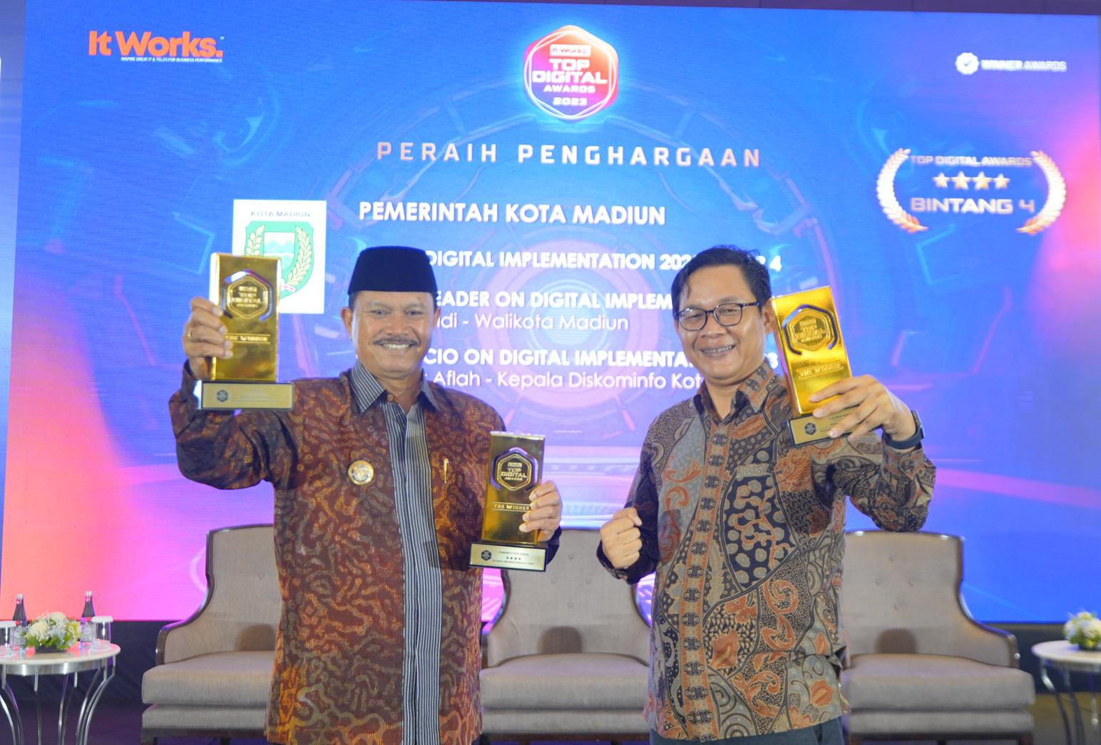 Selain Top Digital Implementation 2023 Level Stars 4 untuk Dinas Kominfo Kota Madiun tersebut, dua penghargaan lainnya yakni Top Leader on Digital Implementation 2023 untuk Wali Kota Madiun, Dr. Maidi dan Top CIO on Digital Implementation 2023 untuk Kepala Dinas Kominfo Kota Madiun Noor Aflah. Ketiga penghargaan tersebut diberikan bersamaan puncak acara Penghargaan TOP Digital Awards 2023 di Raffles Hotel, Jakarta, Senin, (4/12).