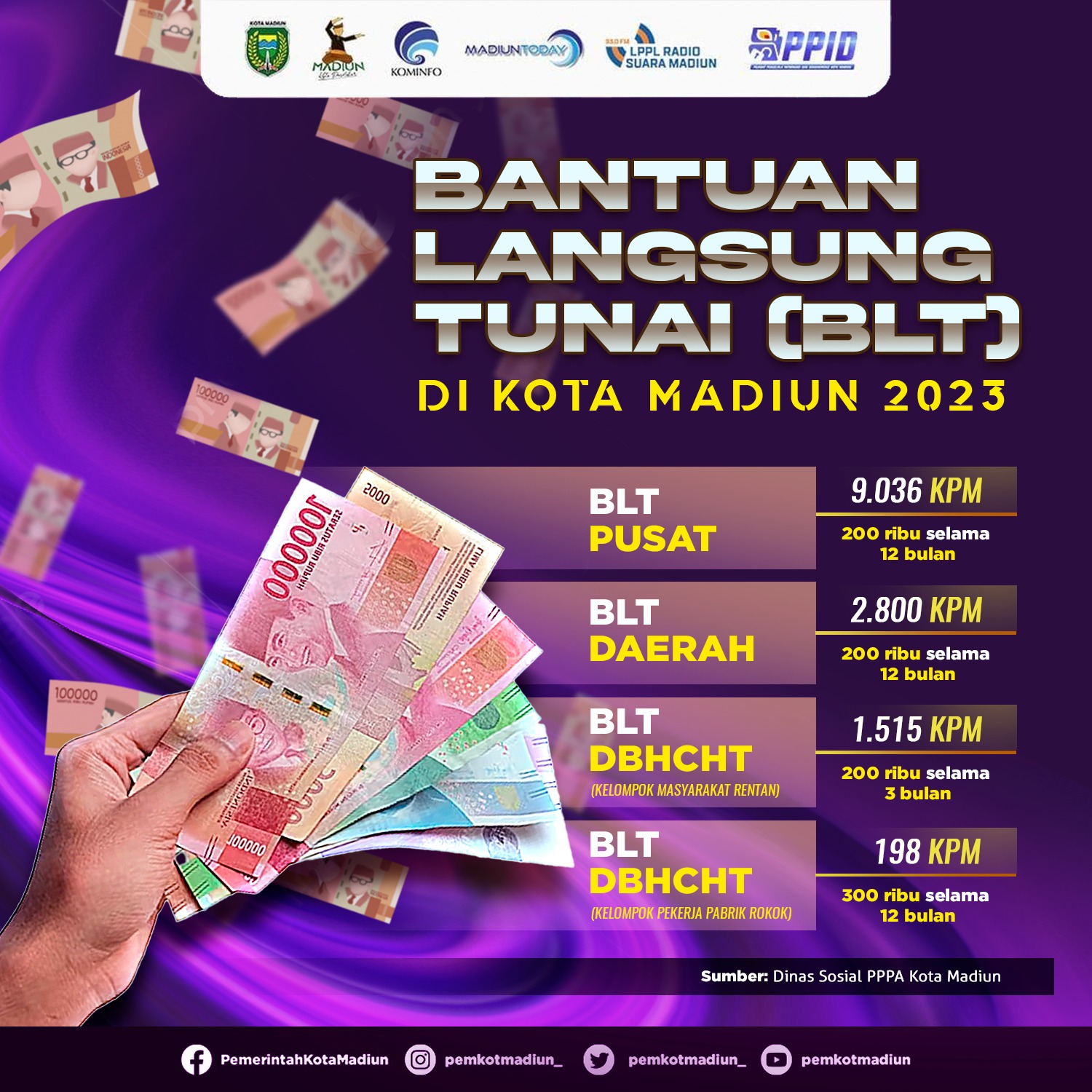 MADIUN – Penyaluran Bantuan Langsung Tunai (BLT) 2023 di Kota Madiun telah selesai dilakukan. Setidaknya, ada empat jenis BLT yang telah disalurkan dengan total 13.547 keluarga penerima manfaat (KPM). Keempat jenis BLT tersebut yakni, BLT pusat sebanyak 9.036 KPM, BLT Daerah sebanyak 2.800 KPM, BLT DBHCHT kelompok masyarakat rentan sebanyak 1.515 KPM, dan BLT DBHCHT kelompok pekerja pabrik rokok sebanyak 198 KPM.