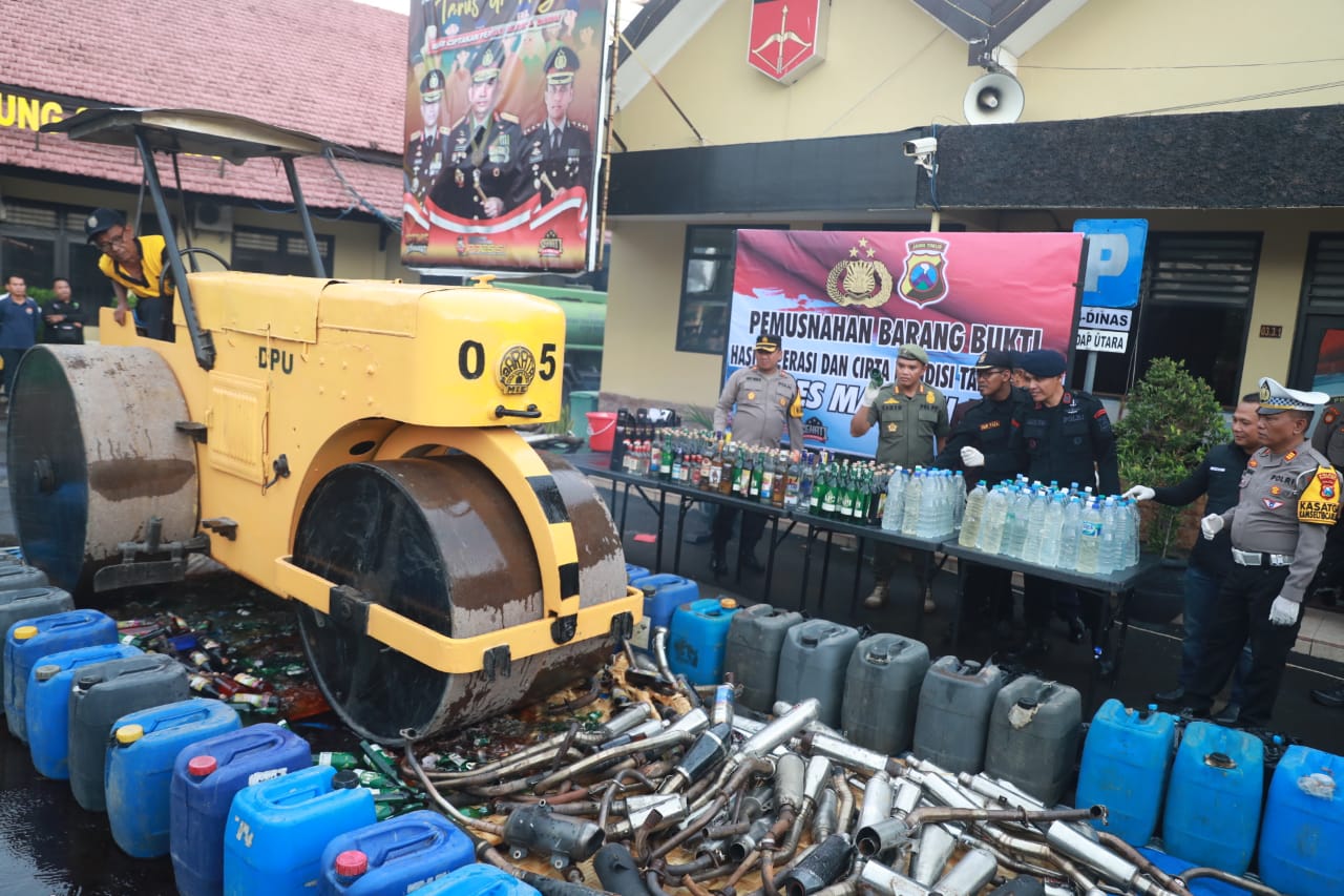 Adapun barang bukti yang dimusnahkan antara lain 1,04 gram Narkotika, 1.342 liter minuman keras (miras) jenis arak jowo dengan rincian 28 jeriken dan 334 botol kemasan air mineral, 100 knalpot brong, 19 minuman keras jenis Vodka, dan 97 minuman keras jenis anggur merah.