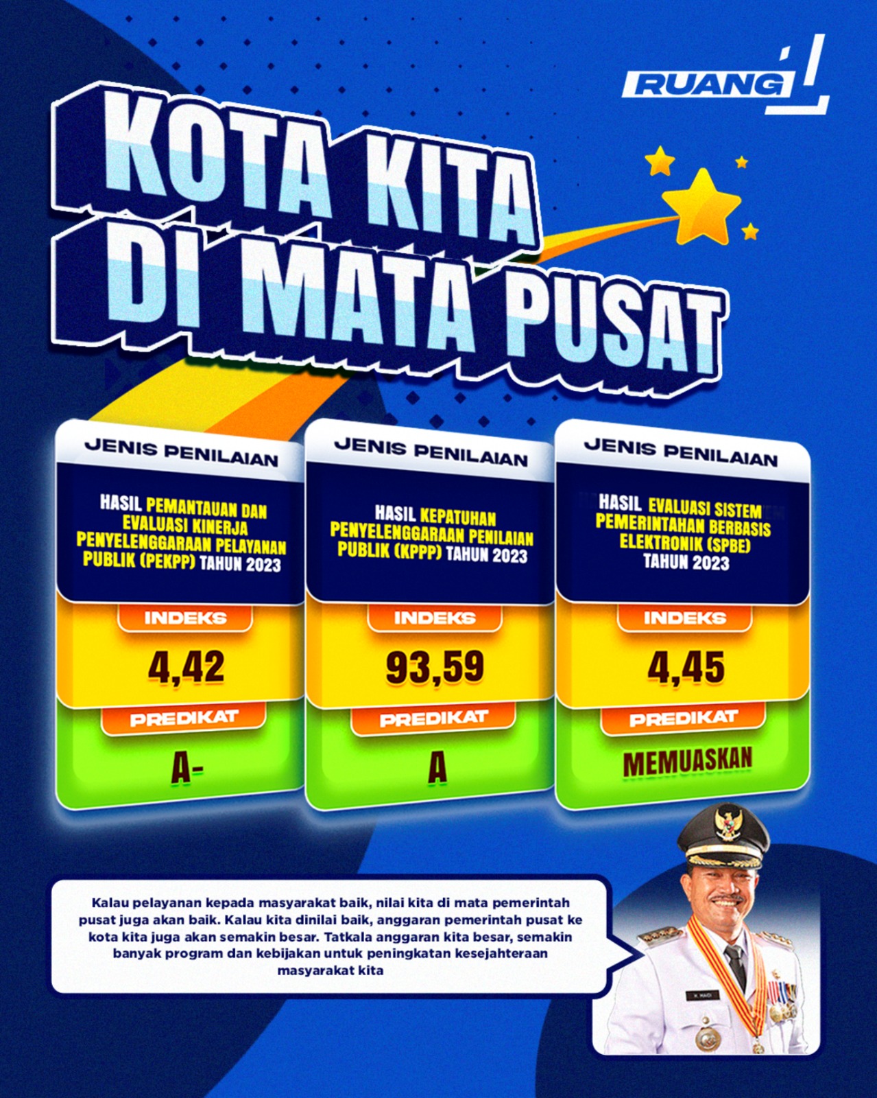 Pertama terkait PEKPP. Hasil Pemantauan dan Evaluasi Kinerja Penyelenggaraan Pelayanan Publik kota kita untuk 2023 mendapatkan nilai A-. Penilaian ini dilakukan pemerintah pusat melalui Kementerian Pendayagunaan Aparatur Negara dan Reformasi Birokrasi (KemenPAN-RB). Nilai ini turun pada Desember 2023 lalu melalui Keputusan MenPAN-RB nomor 795/2023. Sesuai dengan namanya, penilaian ini menekankan kepada prosedur pelayanan publik di kota kita. Termasuk kelengkapan standar pelayanan kepada masyarakat.