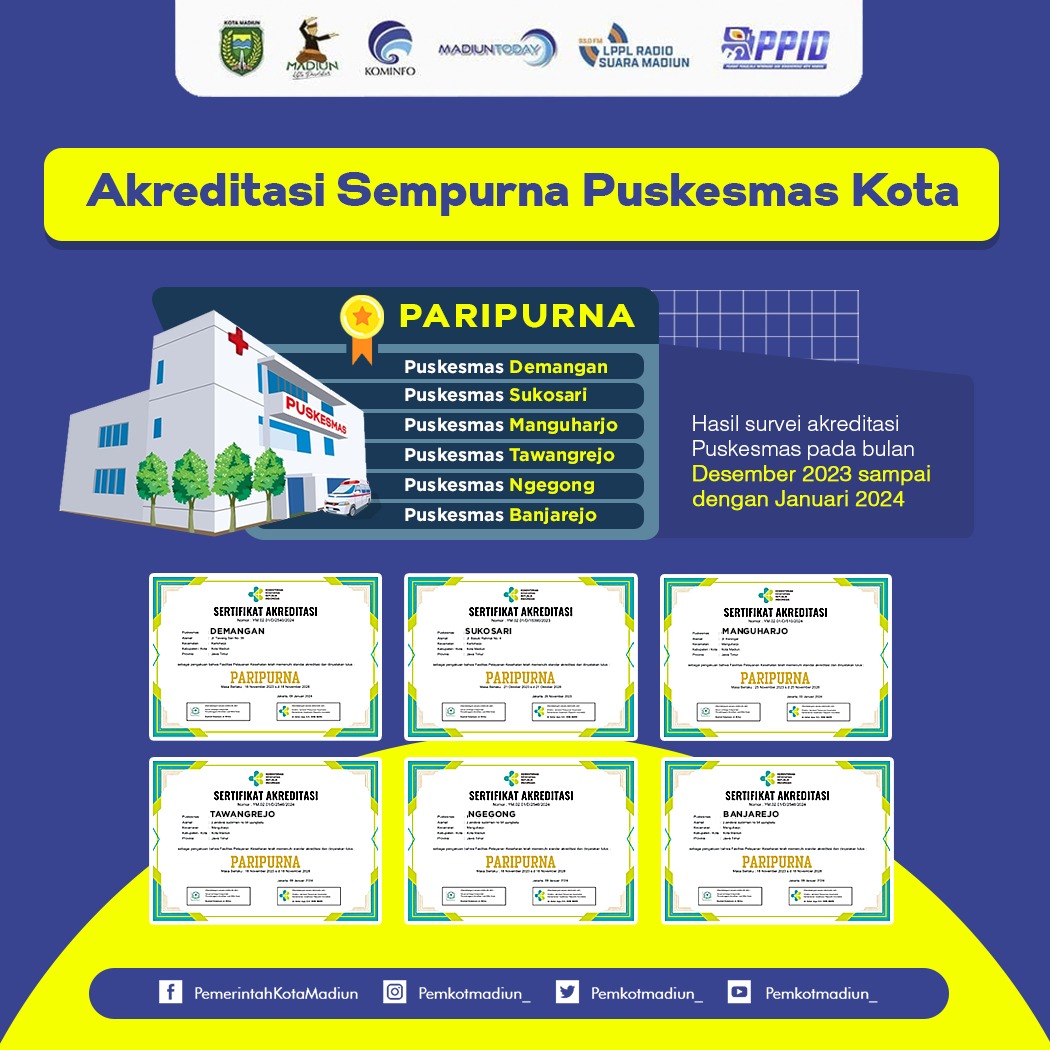 ‘’Dari enam Puskesmas kita, ada dua yang sudah berstatus akreditasi paripurna. Yakni, Puskesmas Tawangrejo dan Puskesmas Manguharjo. Artinya, dua Puskesmas ini berhasil mempertahankan status akreditasi paripurna,’’ ungkapnya sembari menyebut hasil penilaian diterima bertahap dari Desember 2023 hingga Januari 2024.