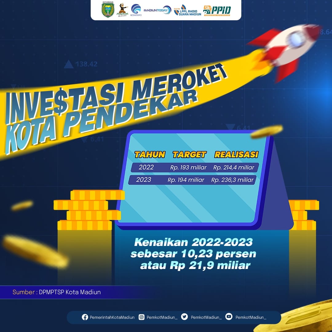 MADIUN – Investasi di Kota Madiun juga terus meroket. Hal itu terlihat dari data yang dikeluarkan Dinas Penanaman Modal Pelayanan Terpadu Satu Pintu (DPMPTSP) Kota Madiun. Nilai investasi di Kota Pendekar mencapai Rp 236,3 miliar pada 2023 lalu. Jumlah tersebut meningkatkan 10,23 persen jika dibanding realisasi tahun sebelumnya.