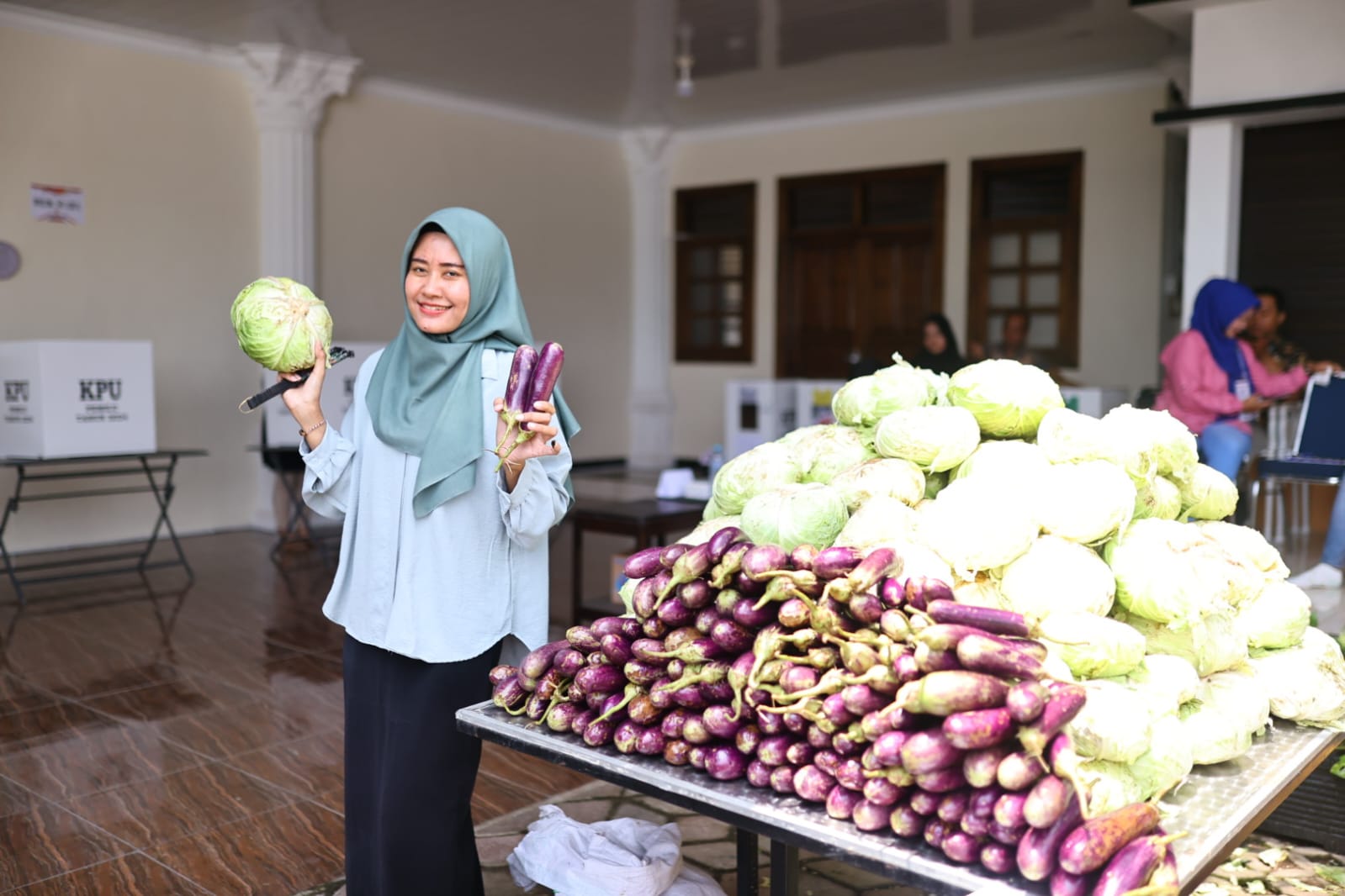 Adapun sayuran berupa kol dan terong dibagikan kepada warga yang sudah menggunakan hak pilihnya. Selain itu juga tersedia kuliner bakso dan es dawet yang bisa langsung dinikmati.