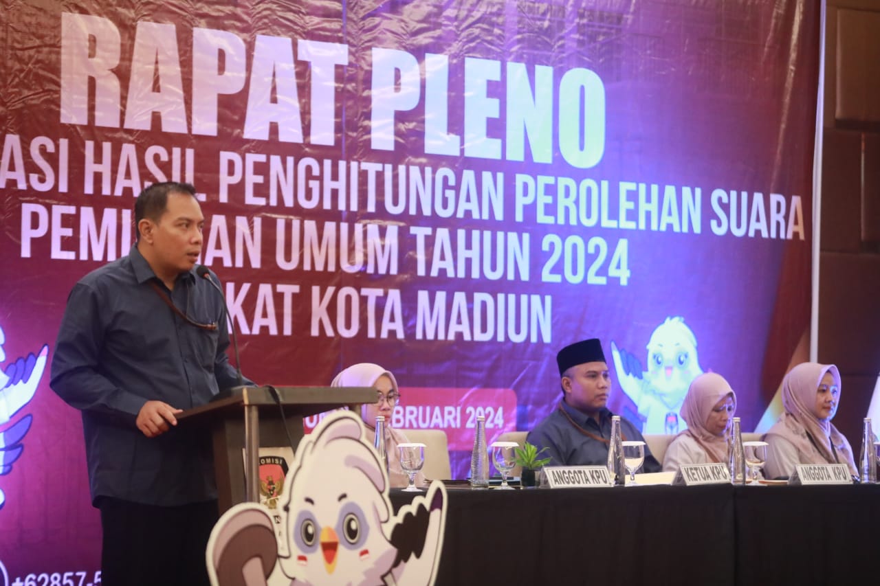 MADIUN - Komisi Pemilihan Umum (KPU) Kota Madiun menggelar rapat pleno terbuka rekapitulasi dan penetapan hasil perhitungan perolehan suara dalam Pemilu 2024 tingkat kota.