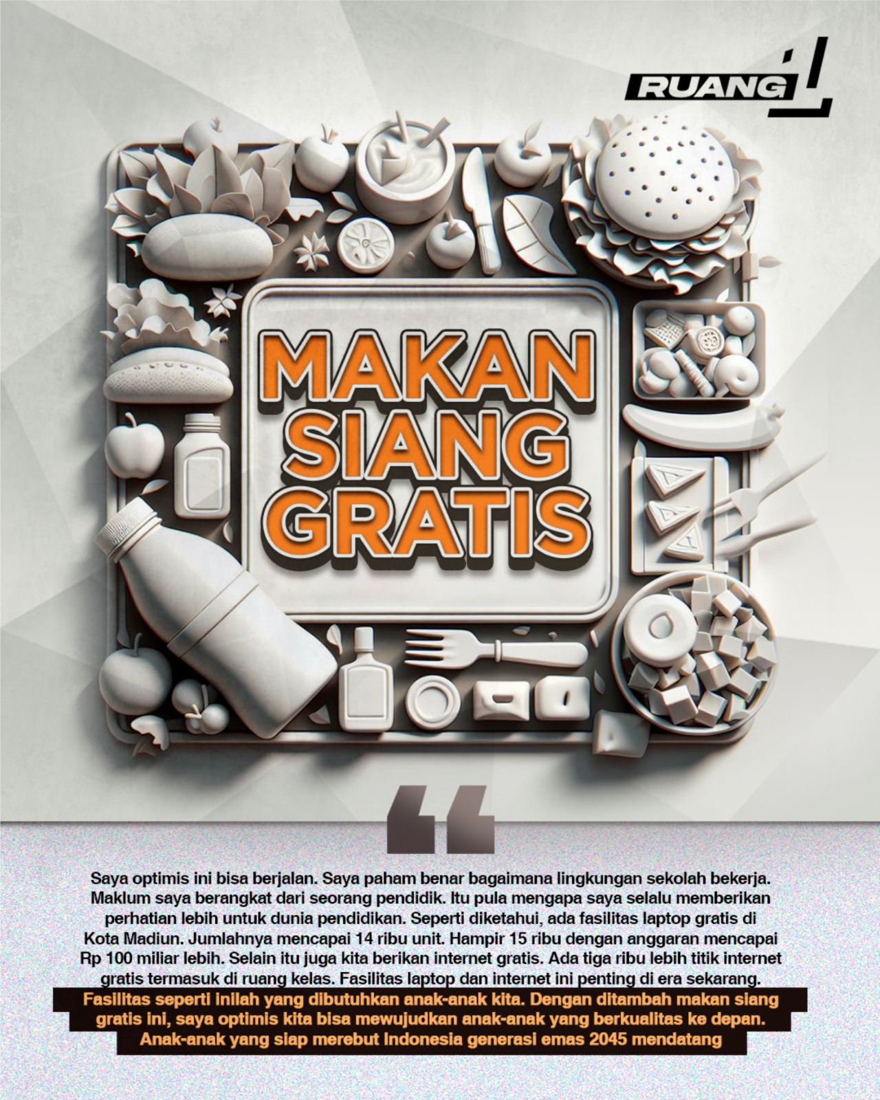 Saya optimis ini bisa berjalan. Saya paham benar bagaimana lingkungan sekolah bekerja. Maklum saya berangkat dari seorang pendidik. Itu pula mengapa saya selalu memberikan perhatian lebih untuk dunia pendidikan. Seperti diketahui, ada fasilitas laptop gratis di Kota Madiun. Jumlahnya mencapai 14 ribu unit. Hampir 15 ribu dengan anggaran mencapai Rp 100 miliar lebih. Selain itu juga kita berikan internet gratis. Ada tiga ribu lebih titik internet gratis termasuk di ruang kelas. Fasilitas laptop dan internet ini penting di era sekarang. Fasilitas seperti inilah yang dibutuhkan anak-anak kita. Dengan ditambah makan siang gratis ini, saya optimis kita bisa mewujudkan anak-anak yang berkualitas ke depan. Anak-anak yang siap merebut Indonesia generasi emas 2045 mendatang.