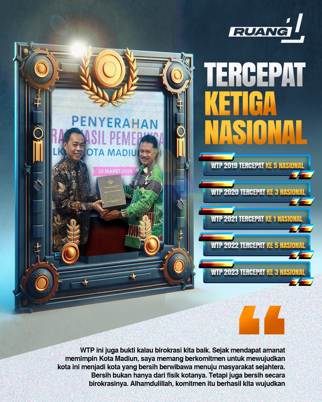 WTP ini juga bukti kalau birokrasi kita baik. Sejak mendapat amanat memimpin Kota Madiun, saya memang berkomitmen untuk mewujudkan kota ini menjadi kota yang bersih berwibawa menuju masyarakat sejahtera. Bersih bukan hanya dari fisik kotanya. Tetapi juga bersih secara birokrasinya. Alhamdulillah, komitmen itu berhasil kita wujudkan. Tidak hanya di tahun ini. Tetapi di lima tahun terakhir. Selama lima tahun kebelakang, kota kita selalu meraih predikat WTP ini. Jika dengan sebelum saya menjabat, sudah tujuh kali berturut-turut kota kita mendapatkan predikat ini. Sebelum itu kita pernah meraih predikat wajar dengan pengecualian (WDP). Tepatnya, pada 2016 silam.