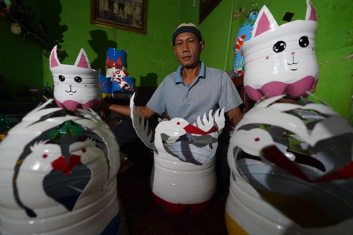 Pria berusia 52 tahun itu mengaku baru awal puasa ini membuat kerajinan tersebut. Mulai dari karakter hewan, buah, hingga tanaman dibuatnya sendiri.