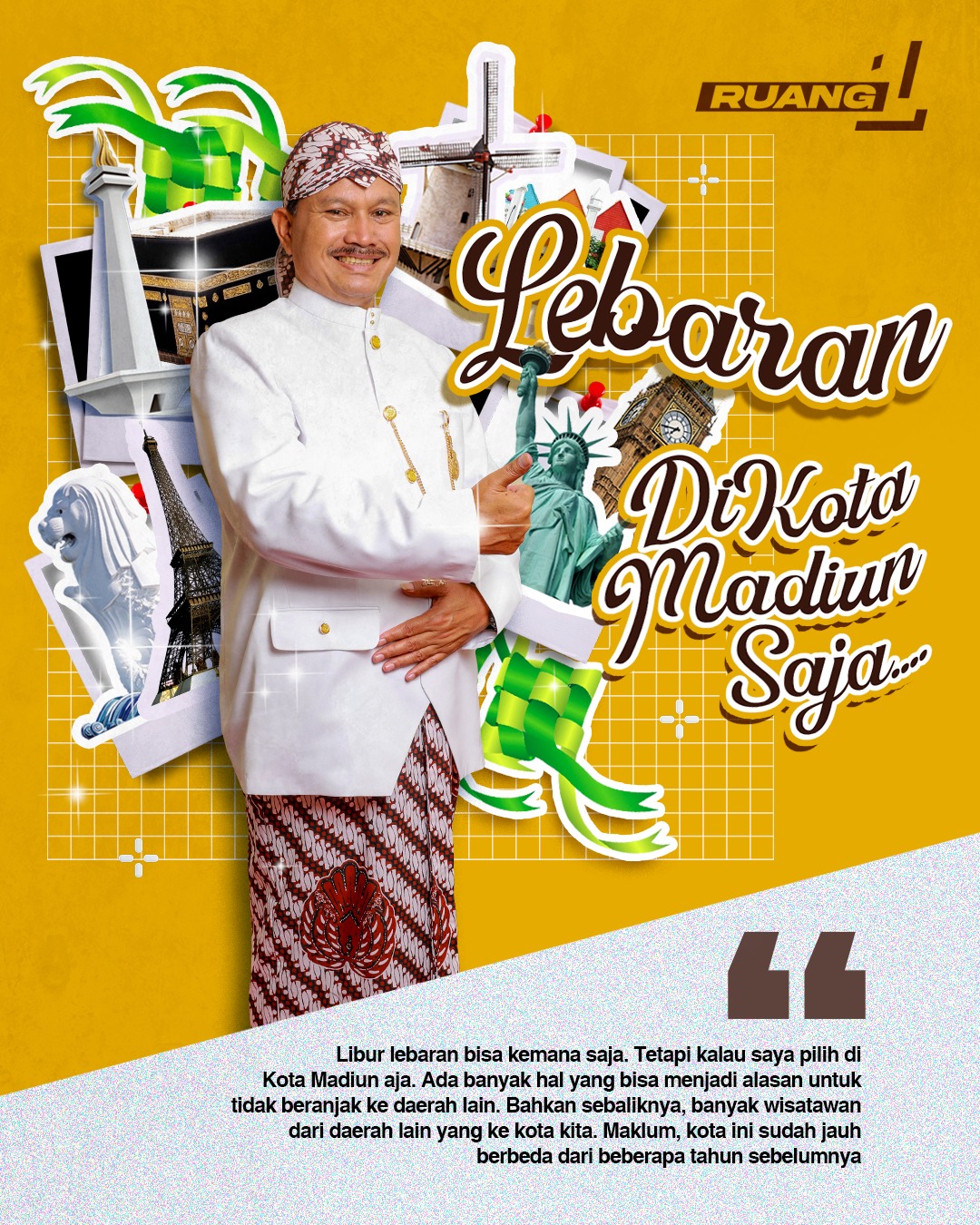 Lebaran 1445 hijriah sudah di depan mata. Tinggal beberapa hari saja Hari Kemenangan itu pun tiba. Lebaran ini bukan hanya hari besarnya umat muslim. Tetapi juga seluruh masyarakat. Bagaimana tidak mereka yang tidak merayakan Idul Fitri pun juga libur. Libur lebaran kali ini juga cukup panjang. Kalau ditambah dengan libur akhir pekan, ada sepuluh hari. Waktu yang cukup panjang untuk rehat dari rutinitas yang dikerjakan. Tak heran, setiap daerah berlomba menyiapkan daerahnya masing-masing untuk menyambut para pemudik dan wisatawan. Tak terkecuali Kota Madiun, kota kita tercinta.