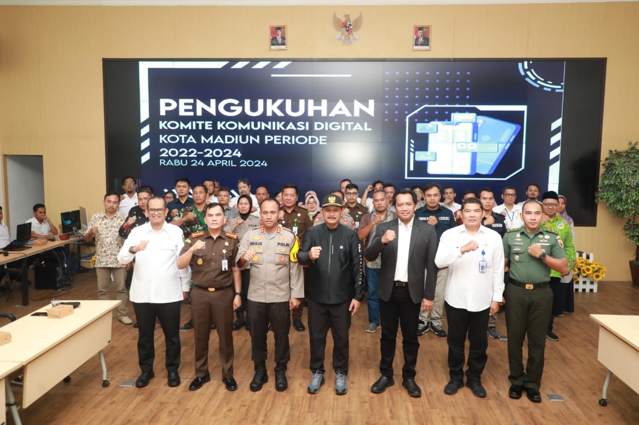 MADIUN – Kota Madiun resmi memiliki Komite Komunikasi Digital (KKD). Itu setelah pengukuhan KKD untuk periode 2022-2024 itu yang dilakukan Wali Kota Madiun, Dr. Maidi di GCIO Dinas Kominfo Kota Madiun, Rabu (24/4). Keberadaan KKD ini penting untuk mengoptimalkan sinergitas antar instansi terkait permasalahan dunia digitalisasi.