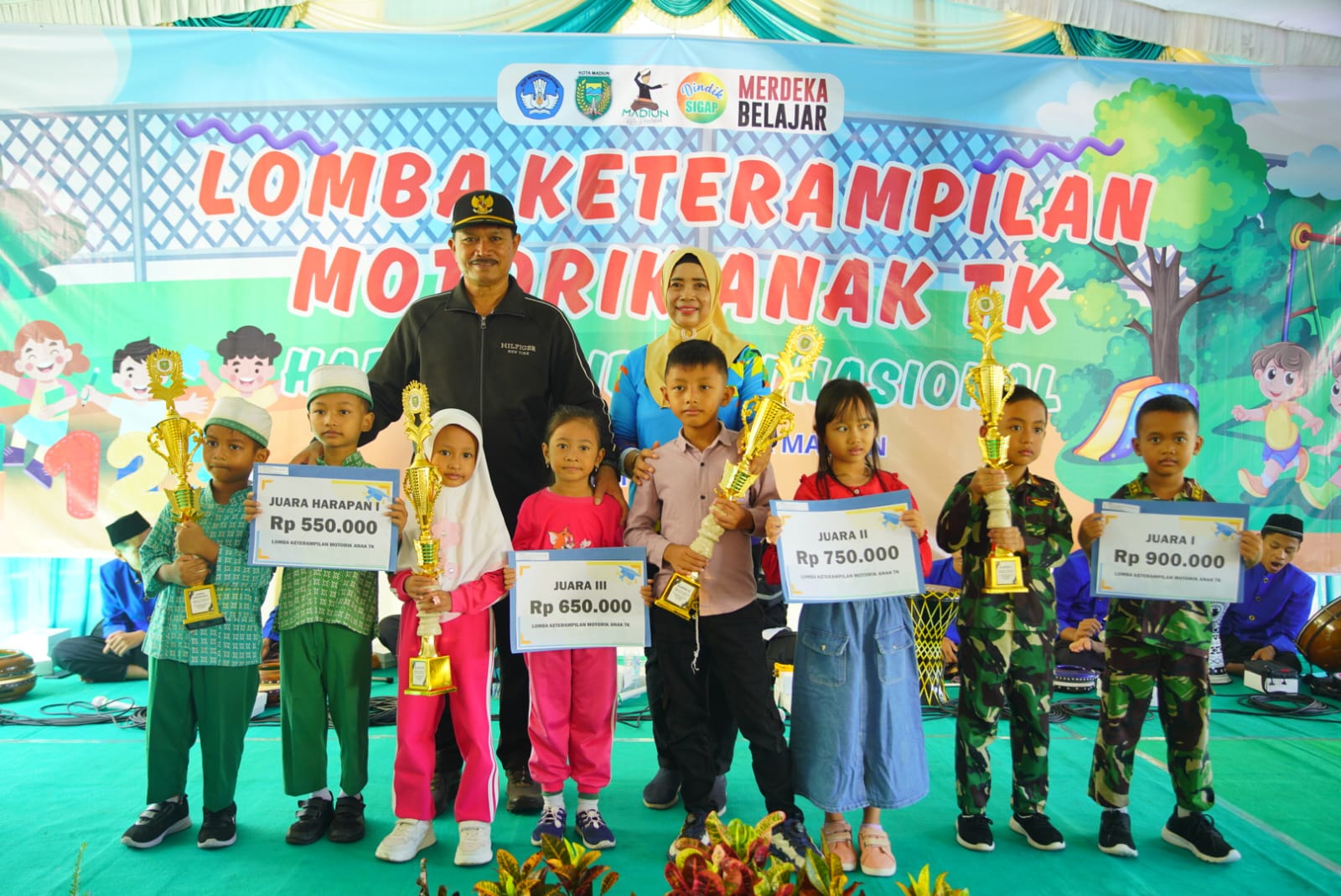 MADIUN - Setelah melalui berbagai tahapan, lomba Kelompok Kerja Guru (KKG) PAUD dan Hari Pendidikan Nasional (Hardiknas) telah berhasil dilalui. Jumat (26/4), para pemenang pun menerima hadiah.