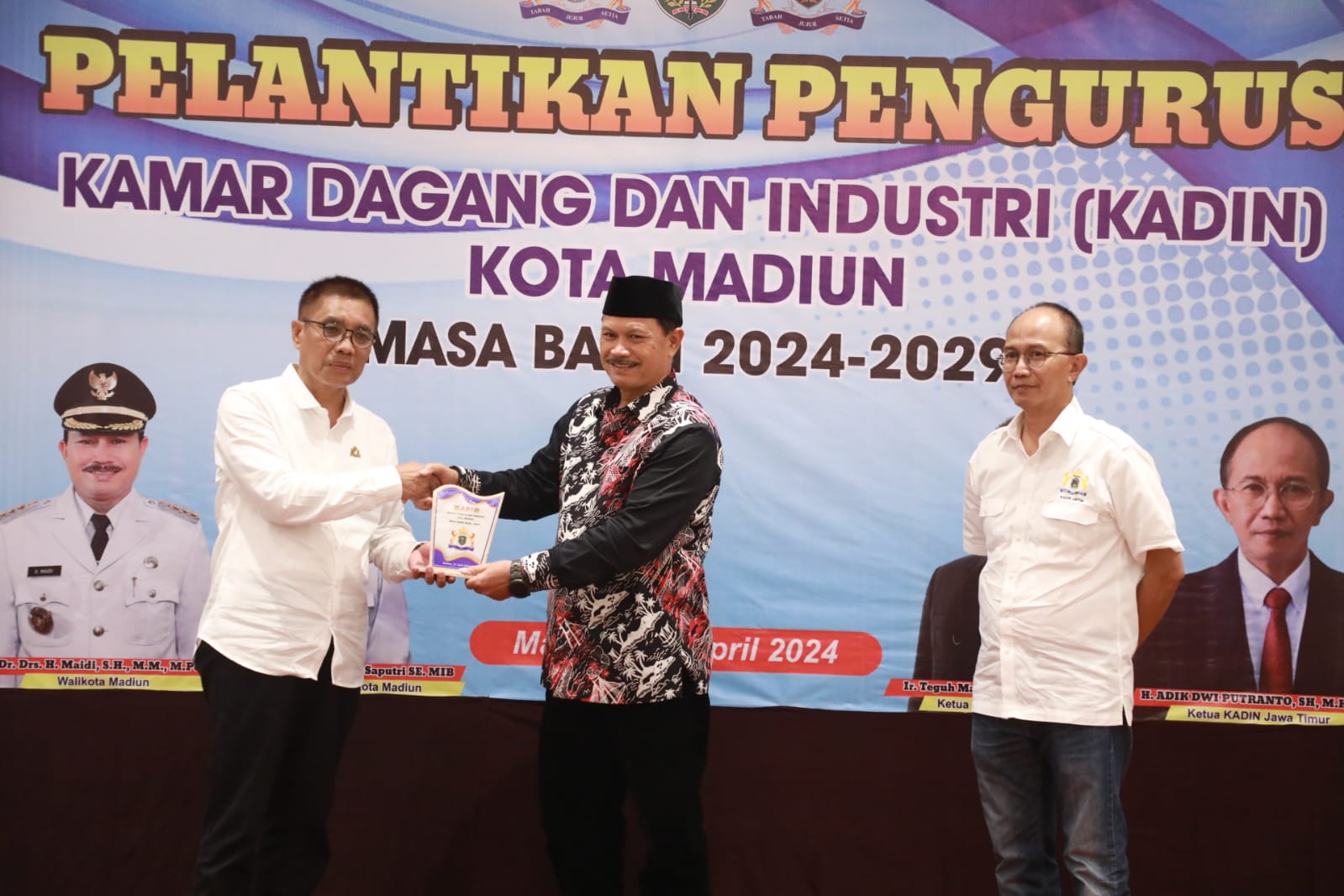 MADIUN – Kamar Dagang dan Industri (Kadin) Kota Madiun resmi memiliki kepengurusan baru. Prosesi pengukuhan dan pelantikan kepengurusan untuk masa bakti 2024-2029 ini berlangsung khidmat di Sun Hotel, Sabtu (27/4) malam. Prosesi semakin khidmat dengan kehadiran Wali Kota Madiun, Dr. Maidi.