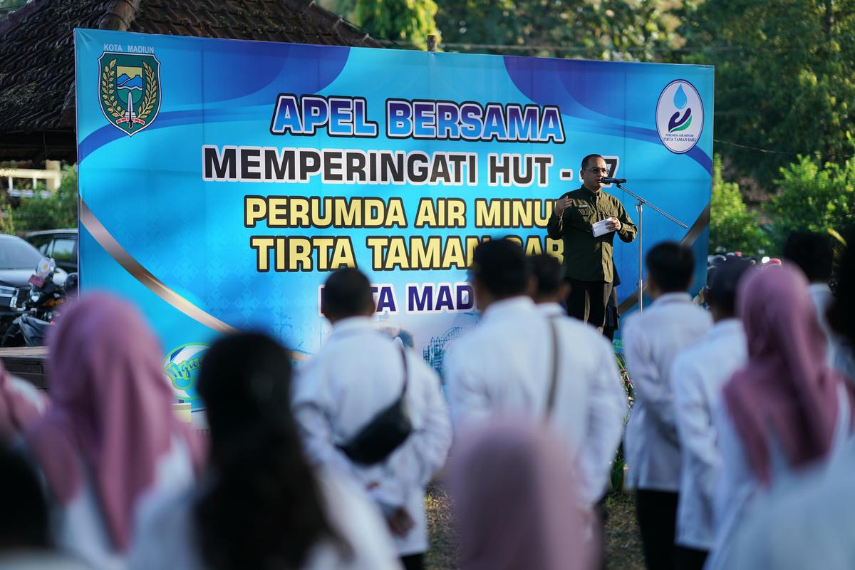 MADIUN – Hari pertama bertugas, Pj. Wali Kota Madiun Eddy Supriyanto memimpin apel bersama dalam rangka Hari Ulang Tahun ke-47 PDAM Tirta Taman Sari Kota Madiun. Prosesi tersebut berlangsung di Kebun Buah Ngrowo Bening Edupark, Selasa (30/4).