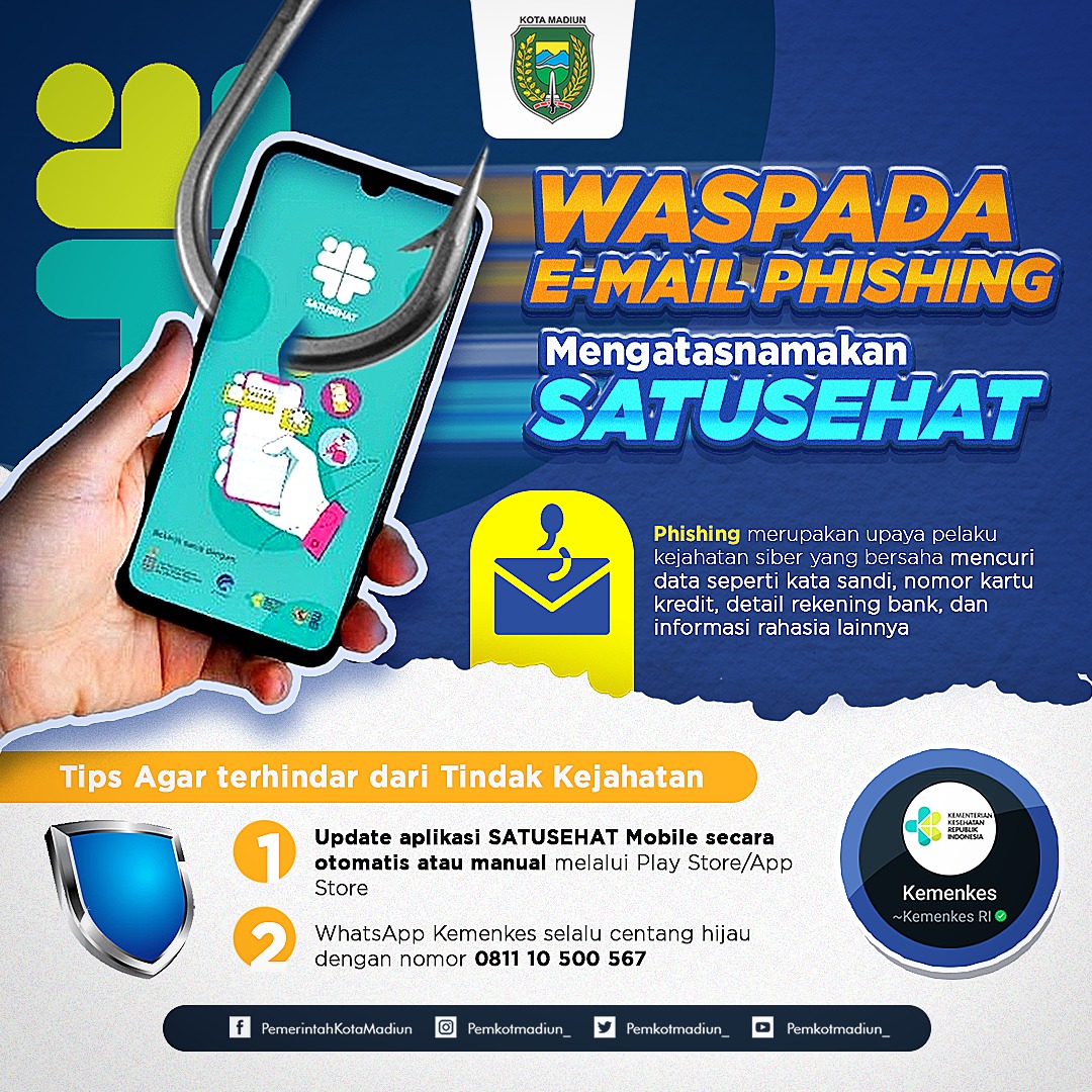 MADIUN - Kementerian Kesehatan (Kemenkes) mengimbau semua pihak untuk waspada dengan berbagai praktik kejahatan siber yang dapat mengganggu pemanfaatan program transformasi digital kesehatan seperti email phisingmengatasnamakan SATUSEHAT.