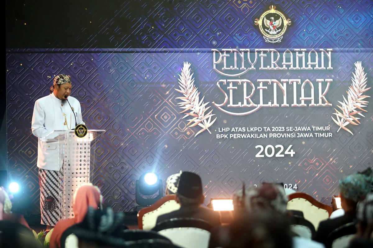 SIDOARJO – Badan Pemeriksa Keuangan (BPK) RI Perwakilan Provinsi Jawa Timur menggelar penyerahan serentak Laporan Hasil Pemeriksaan (LHP) atas Laporan Keuangan Pemeriksaan Daerah (LKPD) tahun anggaran 2023. Giat penyerahan serentak itu berlangsung di kantor BPK RI Perwakilan Jawa Timur di Sidoarjo, Kamis (2/5). Menariknya, Kota Madiun satu-satunya daerah yang tidak dipanggil ke depan untuk menerima LHP tersebut. Maklum, LHP Kota Pendekar sudah lebih dulu diberikan.