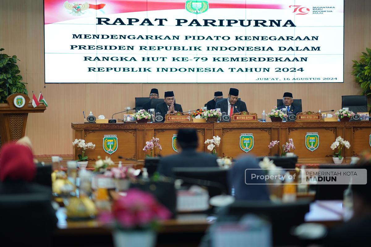 MADIUN - Dewan Perwakilan Rakyat Daerah (DPRD) Kota Madiun menggelar rapat paripurna dengan agenda mendengarkan pidato kenegaraan Presiden Republik Indonesia Joko Widodo, Jumat (16/8).