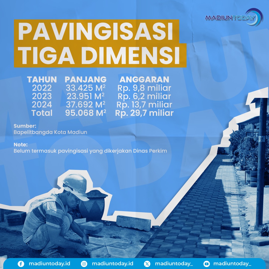 Rinciannya, pada 2022 lalu pekerjaan pavingisasi ini sepanjang 33.425 meter persegi. Untuk pekerjaan ini Pemkot Madiun menggelontorkan sebesar Rp 9,8 miliar. Pada tahun itu Kota Madiun juga berhasil mencatatkan rekor di Museum Rekor Dunia Indonesia (MURI) dengan pavingisasi sepanjang 46 ribu meter. Jumlah tersebut tercapai dengan pavingisasi yang Dikerjakan Dinas Perkim.