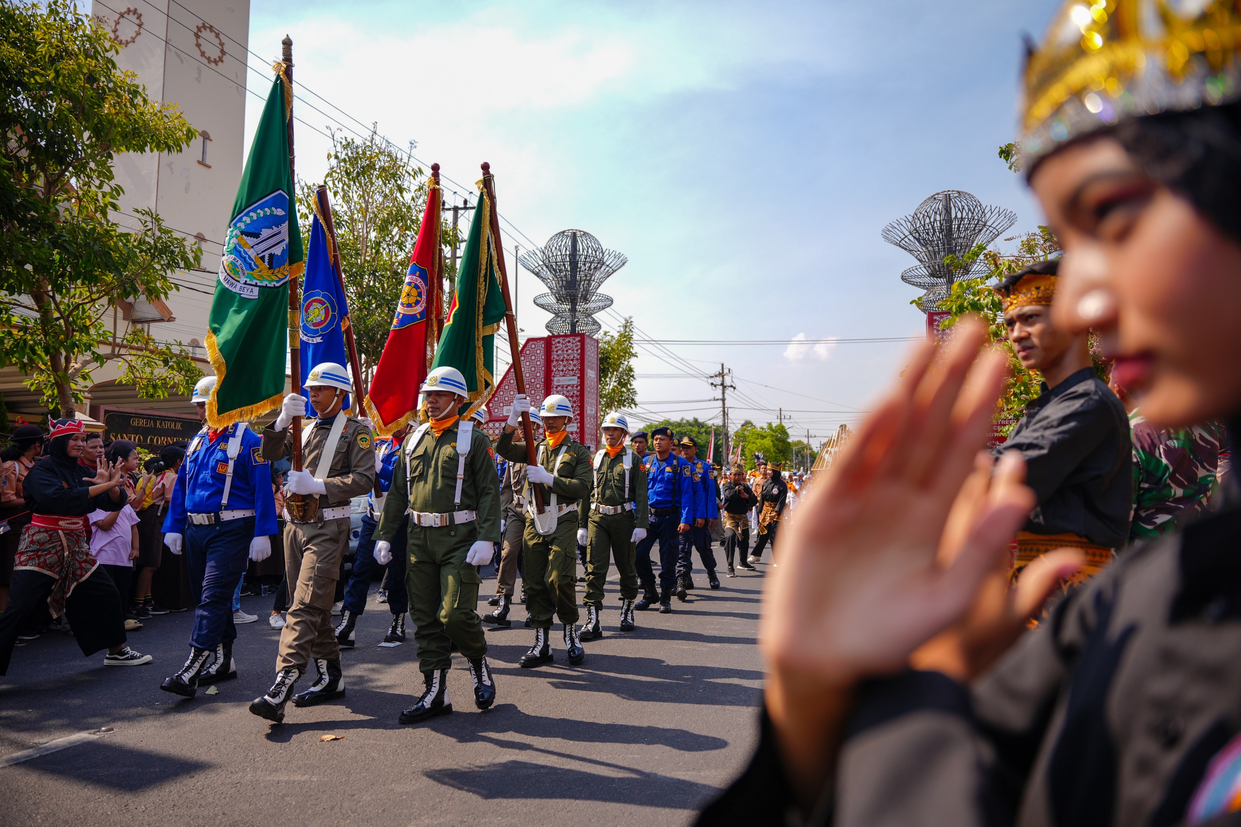 Tak heran, bendera yang dikirab juga bertambah. Setidaknya, ada delapan bendera yang dikirab kali ini. Yakni, Bendera Merah Putih, Pataka Jer Basuki Mawa Beya, Pataka Satuan Polisi Palong Praja (Praja Wibawa), Pataka Satuan Perlindungan Masyarakat (Linmas), Pataka Satuan Pemadam Kebakaran dan Penyelamatan (Yudha Brama Jaya), bendera logo Hari Jadi ke-79 Provinsi Jawa Timur, dan ditambah bendera lambang KPU serta bendera lambang Bawaslu.