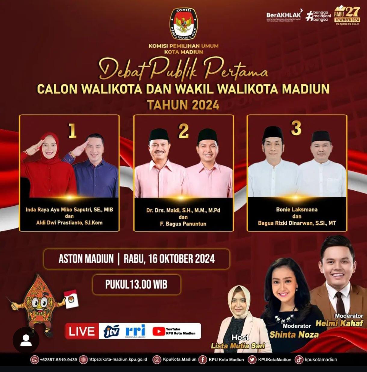 Hari pemungutan suara Pemilihan Kepala Daerah (Pilkada) semakin dekat. Nah, sudah punya pilihan belum nih? Jangan asal memilih ya. Kenali dan pahami visi-misi terlebih dahulu pasangan calon pilihan kalian. Jangan hanya lewat baleho dan kampanye ya. Pahami lebih mendalam pasangan calon pilihan kalian melalui Debat Publik yang difasilitasi KPU Kota Madiun. Debat Publik perdana akan dilaksanakan, Rabu 16 Oktober di Aston Hotel Madiun. Namun, kehadiran di lokasi debat tentu terbatas ya. Kalian yang tidak bisa hadir bisa menyaksikan siaran langsung di JTV, RRI serta Live Streaming channel YouTube KPU Kota Madiun mulai pukul 13.00 WIB. Jangan sampai ketinggalan ya. Pemilih pintar kenali calon pilihan secara mendalam. (ws hendro/agi/madiuntoday)