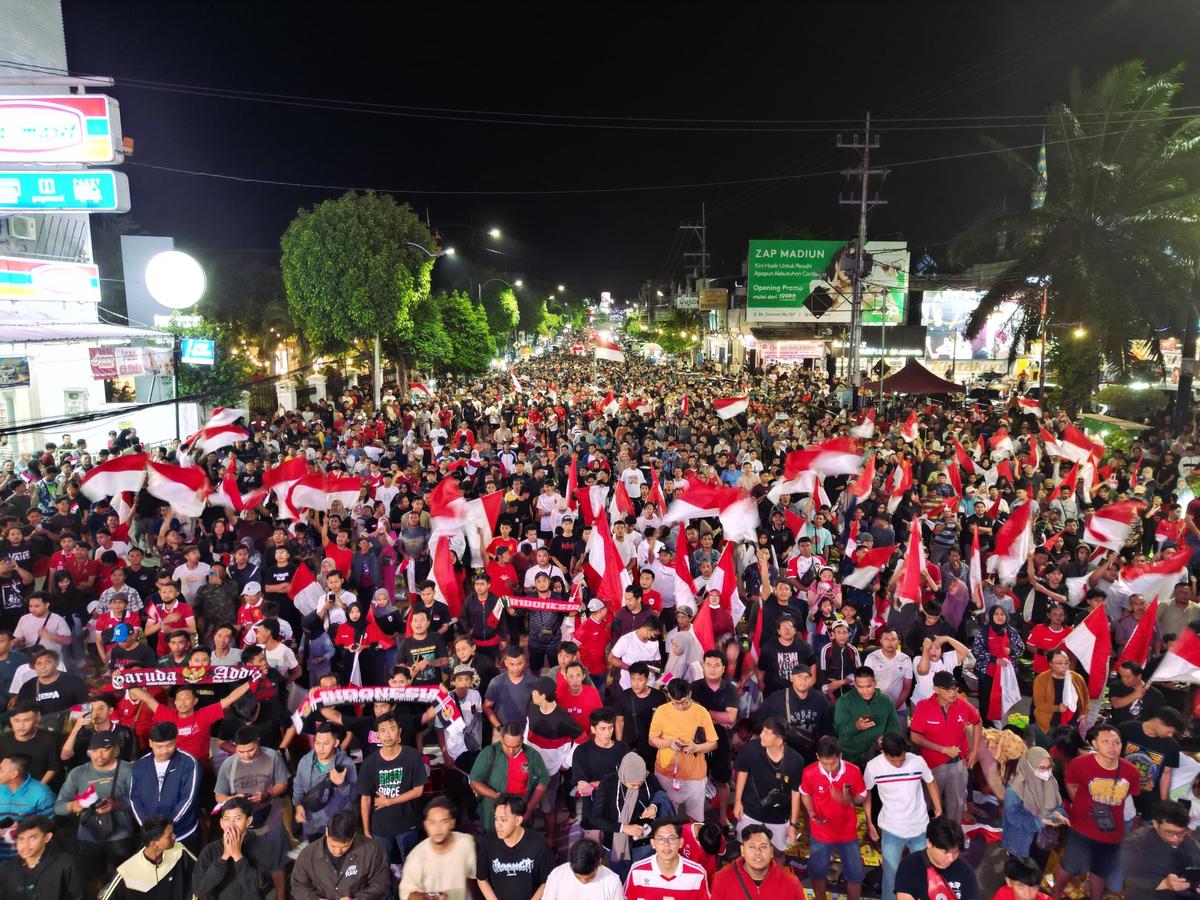 Meski gagal meraih kemenangan, dukungan masyarakat di Kota Pendekar tak pernah padam. Ribuan masyarakat tumblek blek dalam gelaran nonton bareng (nobar) yang digelar Pemerintah Kota Madiun di videotron Jalan Kolonel Marhadi kawasan Alun-alun Kota Madiun tersebut. Nobar makin meriah dengan hadiah undian berupa dua sepeda dari Pemerintah Kota Madiun yang diundi kala jeda. Sejumlah moment keseruan nobar di Alun-alun kemarin tentu sayang untuk dilewatkan. Berikut foto-foto keseruan nobar Timnas bersama Pj Wali Kota Madiun, Eddy Supriyanto. (dspp/agi/madiuntoday)