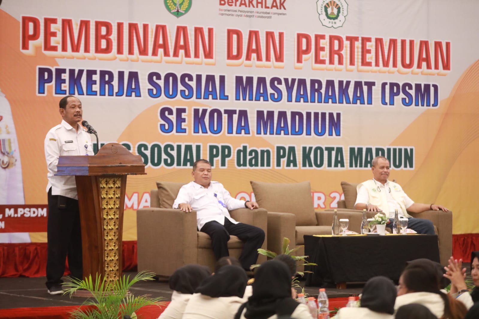 MADIUN - Pekerja sosial masyarakat (PSM) merupakan mitra pemerintah dalam penyelenggaraan kesejahteraan sosial. Sebagai relawan sosial, mereka menjadi kepanjangan tangan pemerintah untuk menyentuh permasalahan warga lebih dekat. Karenanya, PSM memiliki peranan penting di dalam masyarakat.